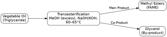 Figure 3 illustrates the transesterification reaction, a key chemical modification for vegetable oils. In this pathway, a triglyceride (representing the vegetable oil) reacts with an alcohol (typically methanol) in the presence of a catalyst to produce fatty acid methyl esters, commonly known as biodiesel, and glycerol [47]. This process involves breaking the ester bonds of the triglyceride and forming new ester bonds with the alcohol. The resulting FAMEs are smaller, less viscous molecules with improved cold-flow properties and enhanced lubricity, making them valuable as bio-lubricant base stocks or fuel components. This specific reaction pathway is widely applied both at laboratory scales and in industrial production due to its relative simplicity and effectiveness in transforming vegetable oils into more suitable lubricant precursors.