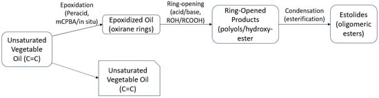 To overcome these intrinsic limitations, extensive research has been dedicated to the chemical and enzymatic modification of vegetable oils [6,15]. Common techniques include epoxidation, transesterification, and esterification [6,8]. Epoxidation introduces oxirane rings into unsaturated fatty acids, enhancing oxidative stability and reducing volatility, although subsequent stabilization with antioxidants is often necessary for long-term durability [8,19]. Transesterification, particularly with polyols, converts triglycerides into esters with reduced viscosity and improved lubricity, expanding their utility in applications such as gear and hydraulic systems [8,20,21]. Prasanth et al. demonstrated a two-step chemical modification process (transesterification followed by epoxidation) to improve the thermal and oxidative stability of oils for industrial use [22].