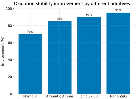 Oxidative degradation is one of the main challenges limiting the long-term performance of vegetable oil-based lubricants due to the presence of unsaturated fatty acids [7]. Antioxidants, including phenolic and aminic compounds, interrupt radical chain reactions and enhance oil stability under thermal stress [7]. Natural antioxidants such as tocopherols and lignin derivatives have also been explored for their biodegradability and non-toxicity, offering more environmentally friendly solutions [7]. Recent studies indicate that the combination of synthetic hindered phenols with natural lignin-based antioxidants can significantly extend induction periods compared to untreated oils [7]. As Figure 5 illustrates, various types of additives, including phenolic compounds, aromatic amines, ionic liquids, and nano ZnO, effectively contribute to the oxidative stability improvement of bio-based lubricants [10].