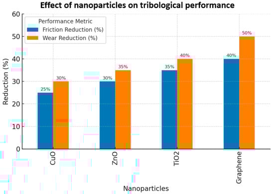 Nanoparticles, including CuO, TiO2, MoS2, graphene, and hexagonal boron nitride (hBN), are among the most researched additives in recent tribological studies [10,40]. Their ultrafine size (typically 1–100 nm) allows them to function through various mechanisms: