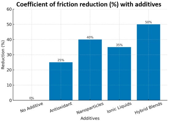 Chemical additives are pivotal in bridging any remaining performance gaps in bio-based lubricants. Nanoparticles, such as CuO, TiO2, MoS2, and graphene, have been extensively researched for their ability to significantly reduce CoF (sometimes by up to 40%) through rolling, mending, and tribofilm formation mechanisms, while also improving extreme pressure and anti-wear properties [10,40]. Ionic liquids, with their tunable polarity and thermal stability, are gaining traction as multifunctional additives that not only improve friction and wear but also boost oxidative resistance in bio-based oils [40].
