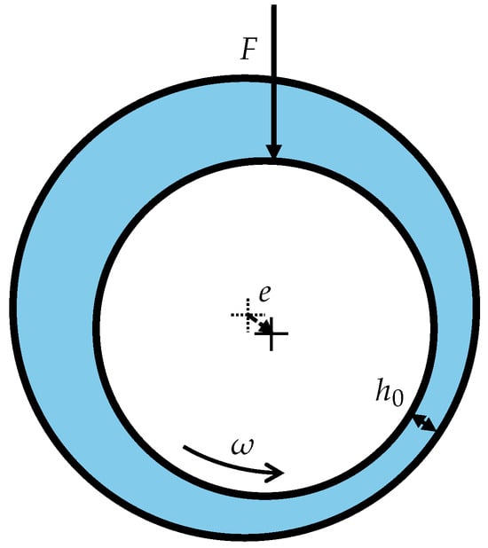 Journal bearings are one category of bearing that consist of a bearing shell, the shaft and a lubricant, as can be seen in Figure 1. The main focus of this contribution is hydrodynamic journal bearings. In this type of bearing, the lubrication film is created through the rotation frequency of the shaft and the simultaneous eccentricity e caused by the acting force F. This causes a constriction of the lubrication film down to the minimum lubrication film thickness . If the minimum lubrication film thickness is large enough to separate the asperities of the shaft from the asperities of the shell, hydrodynamic lubrication is achieved. Journal bearings are generally used in applications where continuous operation at high rotation speeds are required [8], such as in the energy industry [9,10], aircraft turbines [11] and ship drive trains [12].
