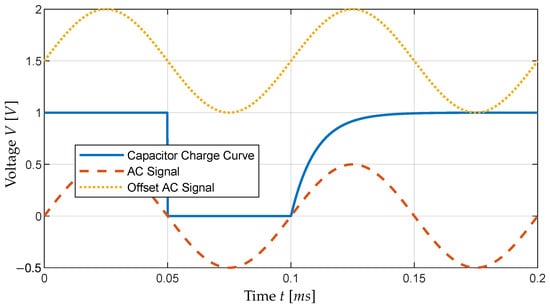 When a capacitance is subjected to a DC voltage, a charging curve can be measured. This charging curve is determined by the time constant , which can be calculated using Equation (1), with the charging resistance R and the capacitance of the capacitor C. It is known that a capacitor reaches of its charge after . Therefore, the time taken until of its charge can be measured and used to calculate the capacitance C [30]. A visualization of such a signal is included in Figure 2 (blue line), using a voltage signal that discharges with a virtual resistance of at s when a discharge is triggered. In reality, the discharge resistance is never , but for the capacitance measurement, this is not important. The charge of the capacitor starting at s is what is measured. The capacitor charges over a known resistance with an observed time constant of s. Using the known resistance R and the measured time constant , the capacitance C can be calculated using Equation (1).