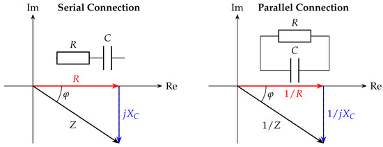 When capacitances are subjected to AC signals, they act as a complex resistance. This resistance is called impedance Z in AC circuits and can be depicted as a complex number according to Equation (2) [28]. This equation uses the resistance of the circuit R and the capacitive reactance of the capacitor .