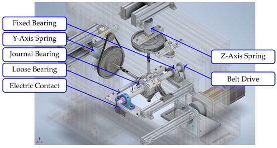 The test bench for this contribution consists of two rolling element support bearings with the journal bearing housing between them, as depicted in Figure 4. Test bench parameters and measurement parameters are depicted in Table 1. The journal bearing housing is free-swinging and only supported by the bearing. One horizontal (y-axis) and one vertical (z-axis) displacement mechanism can be used to apply a load on the bearing housing via disc springs. The mechanisms additionally allow a rotation via belt drives which can be used to set up specific tilt angles of the housing. The tilt angle is measured using eddy current sensors. In this contribution, these are only used to ensure a parallel shaft. The oil used for this contribution is a HLP 46 oil manufactured by Mannol.