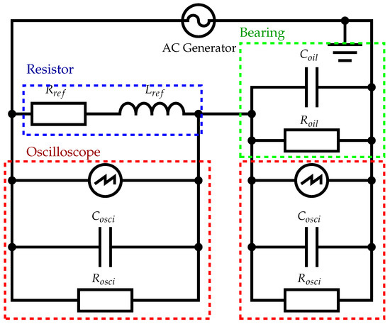 One method found in the literature is the use of the charging curve of the bearing under DC voltage, as used by Wittek and others [7,17,18,19]. Other measurement setups used include voltage dividers, such those used by Martin et al. and others [6,20,21]. Sometimes, this is also referred to as shunt measurement [22] but it is the same working principle. An alternative circuit setup is an AC Wheatstone bridge, as used by Puchtler et al. [3]. Some publications also specifically used an impedance analysis device, such as in Hausmann et al.’s work [5]; however, due to the fact that the device can be considered a black box, this measurement setup is not discussed here.