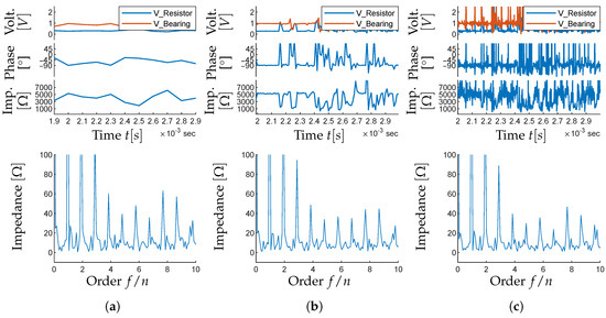 From the results concerning rolling-element bearings, some conclusions can be drawn with regard to the measurement setup used. Clarke et al. use the measured voltage signals directly to monitor the electric behavior of rolling-element bearings [16]. This works in principle; however, the voltage is a result of the electric properties of the bearing and is dependent on the measurement setup. Therefore, for the analysis of the electric behavior, this is not deemed sufficient and a calculation of the electric properties such as capacitance or impedance should be performed to be independent of the measurement setup.