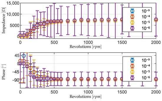 In order to investigate the influence of the window size on the measurement analysis, Figure 7 shows identical measurements taken at 1000 N and 1000 rpm with window sizes between s and s. The analysis is performed using a linear regression algorithm as the FFT analysis can only yield window sizes of up to s, as described in Section 2.5.1. Figure 7a shows the first measurement at a window size of s. That means for each s, the measurement results are fed into a linear regression algorithm that fits the amplitude and the phase of a sine signal to the measurement results. The resulting sine functions describe the two voltages and from which the phase and the impedance are calculated. Therefore, each window yields exactly one value for phase and one value for impedance. For the plots in Figure 7, the time is plotted between 1.9 ms and 2.9 ms, which is kept constant for each of the subfigures. In subfigure (a), that means only ten measurement values are available for the phase and impedance plots. At 200 rpm, mixed lubrication is expected. However, within the selected time interval, the phase does not reach as would be expected during temporary metallic contact. This is because the contacts captured within this time frame are shorter than one window.