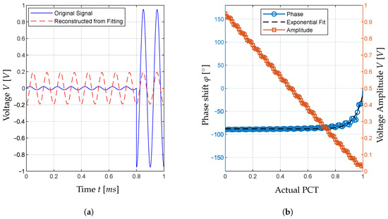 Influence of the PCT on the calculated phase and amplitude for a time window. (a) Simulated voltage signal at with reconstructed signal. (b) Influence of the PCT value on phase and amplitude of a reconstructed signal.