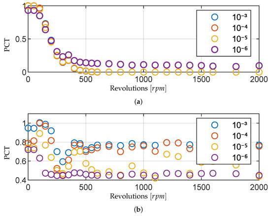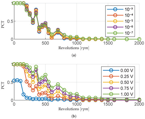 PCT analysis of offset signals with different measurement frequencies and threshold values. (a) PCT analysis of offset signals over the rpm range with threshold value of V using different measurement frequencies. (b) PCT analysis of offset signals over the rpm range with a time between measurement points s and different threshold values (13).