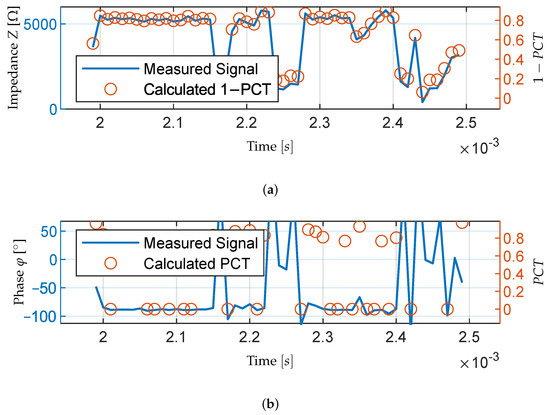 Figure 11 shows the same PCT analysis performed for a short impedance signal. The impedance and phase curves are the same as those used in Figure 7 but additionally, the PCT values for each window are added with a second y-axis. Figure 11a uses the inverse PCT value simply due to the fact that PCT and impedance are inversely proportional, as higher impedance values imply lower PCT values. This way, both values can be compared within one picture.