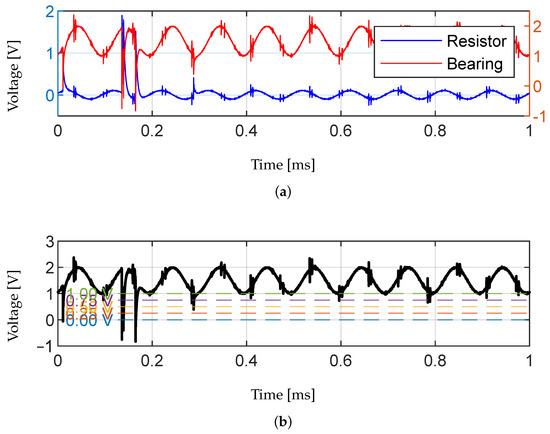 PCT analysis of a time frame within a single measurement at 1300 rpm. (a) Offset voltage signal of resistor and bearing at 1300 rpm. (b) Offset voltage signal of the bearing at 1300 rpm with potential voltage thresholds for PCT analysis at 0 V; 0.25 V; 0.5 V; 0.75 V and 1 V.