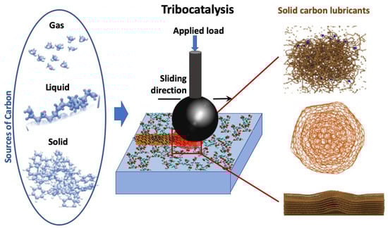 | Tribocatalysis | Catalytic elements in bulk materials, coatings, or powders (e.g., Mo, Ni, Cu, Pt) in the presence of hydrocarbon sources (e.g., liquid: oils, fuels, alcohols; gaseous: methane, ethane, ethanol vapors, and solid: polymers, amorphous carbon | In situ and on-demand formation of carbon-rich protective tribofilms | Continuous replenishment of the protective films through the decomposition of hydrocarbon molecules, compatible with a wide range of ambient air or inert gas environments and high-temperature regimes | Incorporation of catalytic materials, control of the tribocatalysis is possible only with adjustment of the operation conditions, compatibility with surface treatment approaches |