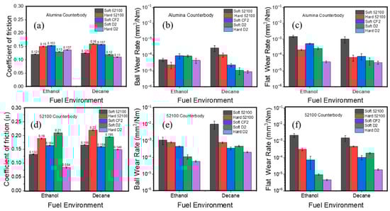 - Macknojia, A.Z.; Montoya, V.L.; Cairns, E.; Eskandari, M.; Liu, S.; Chung, Y.-W.; Wang, Q.J.; Berkebile, S.P.; Aouadi, S.M.; Voevodin, A.A.; et al. Tribological Analysis of Steels in Fuel Environments: Impact of Alloy Content and Hardness. Appl. Sci. 2024, 14, 1898. [Google Scholar] [CrossRef]