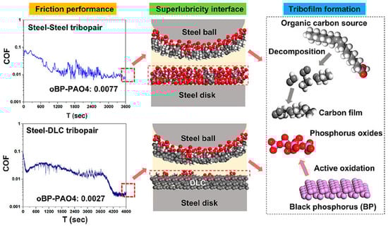 - Gao, K.; Bin, W.; Berman, D.; Ren, Y.; Luo, J.; Xie, G. Self-adaptive macroscale superlubricity based on the tribocatalytic properties of partially oxidized black phosphorus. Nano Lett. 2023, 23, 6823–6830. [Google Scholar] [CrossRef]