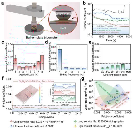 - Du, C.; Yu, T.; Sui, X.; Zhang, Z.; Cai, R.; Zhang, L.; Feng, Y.; Feng, M.; Zhou, F.; Wang, D. Macro-Superlubricity Induced by Tribocatalysis of High-Entropy Ceramics. Adv. Mater. 2025, 37, 2413781. [Google Scholar] [CrossRef]