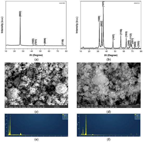 XRD patterns of (a) hBN and (b) ZnO, FE-SEM images of (c) hBN, (d) ZnO, and EDX results of (e) hBN and (f) ZnO.