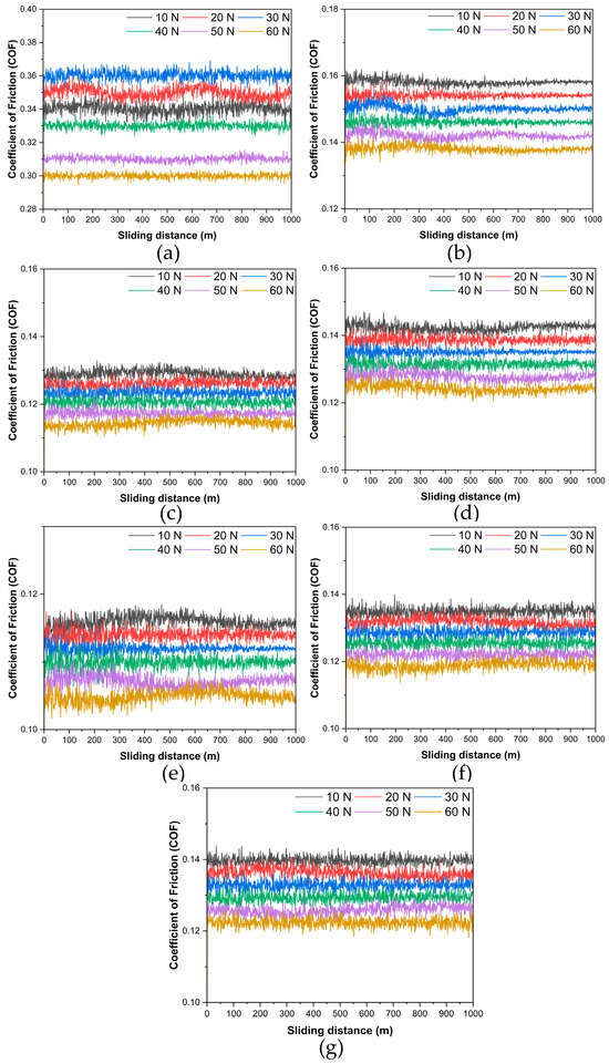 Coefficients of friction according to sliding distance at different loads for conditions: (a) dry, (b) oil lubrication, (c) hBN nanolubricant, (d) ZnO nanolubricant, (e) 75hBN/25ZnO nanolubricant, (f) 50hBN/50ZnO nanolubricant, and (g) 25hBN/75ZnO nanolubricant.