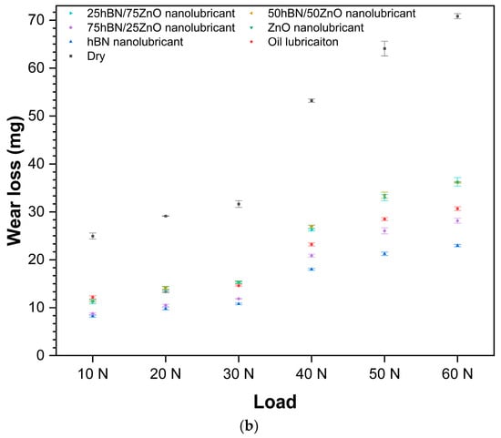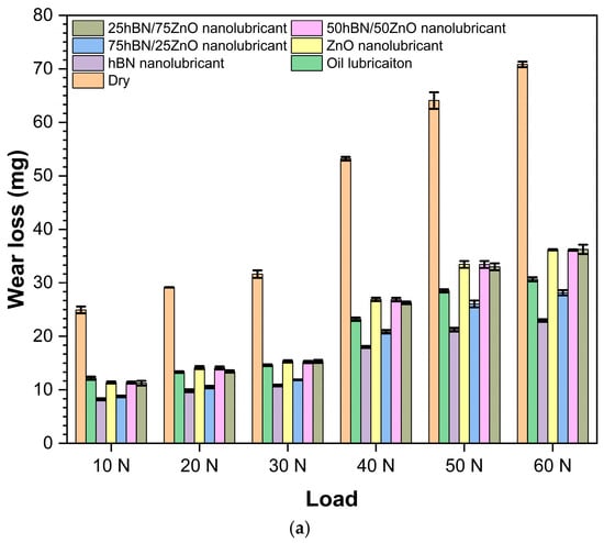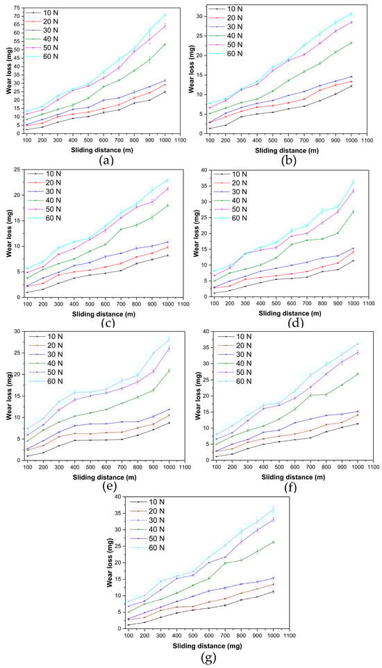 Wear loss according to sliding distance at different loads for conditions: (a) dry, (b) oil lubrication, (c) hBN nanolubricant, (d) ZnO nanolubricant, (e) 75hBN/25ZnO nanolubricant, (f) 50hBN/50ZnO nanolubricant, and (g) 25hBN/75ZnO nanolubricant.