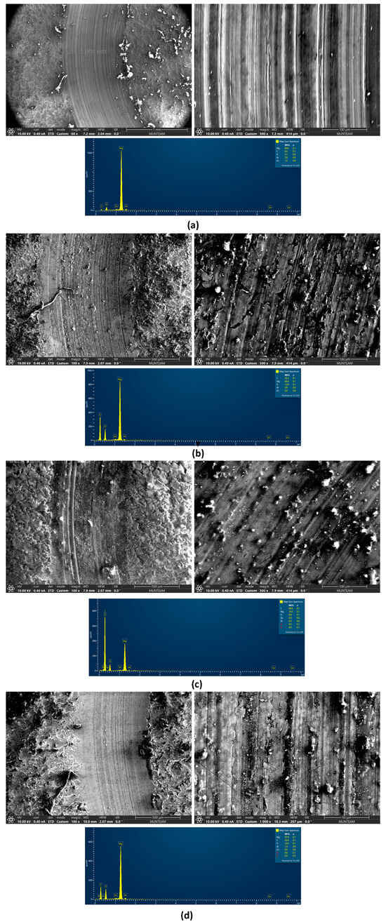 FE-SEM images and EDX results of the worn surfaces obtained at a high load of 60 N under different lubrication conditions: (a) dry, (b) oil, (c) hBN nanoadditive oil, and (d) 75hBN/25ZnO nanoadditive oil.