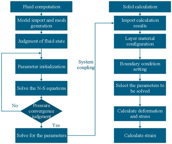 Figure 4 presents the computational methodology for analyzing the laminated water-lubricated bearing. This approach uses a fluid–structure interaction (FSI) framework to couple simulations of the fluid and solid domains. As a result, it evaluates both hydrodynamic lubrication and the liner’s structural response simultaneously. First, the bearing’s geometric model is developed and discretized through mesh generation. The lubricant’s physical properties help characterize the flow regime, informing the selection of governing equations and boundary conditions. Next, the Reynolds and Navier–Stokes equations are solved to determine the pressure distribution in the water film. Key performance metrics, such as load-carrying capacity and frictional behavior, are also evaluated. After the fluid domain analysis, material properties are assigned to the liner layers, and proper boundary conditions are set within the structural mechanics solver. The pressure field from the fluid domain is then transferred to the solid domain via the fluid–solid interface. This allows iterative calculation of stress, strain, and deformation in the liner. Critical mechanical parameters are ultimately extracted from the coupled simulation results to improve design optimization and enhance the reliability assessment of the laminated bearing structure.