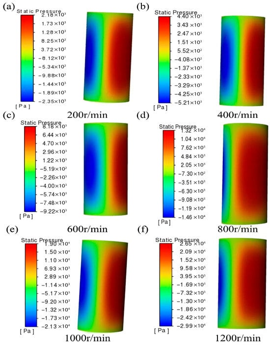Pressure distribution contours under varying rotational speeds at a fixed eccentricity of 0.5: (a) 200 r/min; (b) 400 r/min; (c) 600 r/min; (d) 800 r/min; (e) 1000 r/min; (f) 1200 r/min.