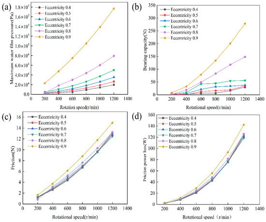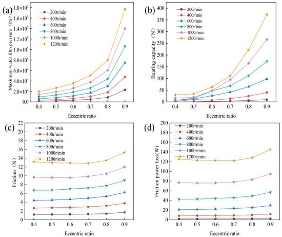 The influence of eccentricity on various parameters: (a) Maximum water film pressure; (b) Bearing capacity; (c) Friction force; (d) Friction power loss.