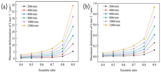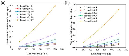Figure 8 depicts the effect of eccentricity on the maximum deformation of various liner materials in a laminated water-lubricated bearing. The results indicate that the maximum deformation in both liners rises with eccentricity, confirming a clear positive correlation. Figure 8a,b detail the maximum deformation for Liner 1 and Liner 2, respectively, across different rotational speeds. A comparative analysis shows that Liner 1 consistently exhibits greater maximum deformation than Liner 2 under all tested conditions. For example, at an eccentricity of 0.4 and 200 r/min, Liner 1 deforms by 0.19381 μm, while Liner 2 deforms only 0.000528 μm. When eccentricity increases to 0.9 and rotational speed reaches 1200 r/min, Liner 1’s deformation reaches 39.429 μm, more than forty times higher than Liner 2’s 0.92904 μm. These differences demonstrate that Liner 2 significantly outperforms Liner 1 in structural rigidity and deformation resistance. The deformation trend is nonlinear: below an eccentricity of 0.8, deformation increases gradually, but beyond this point, both liners show rapidly accelerating deformation, indicating a major change in each liner’s structural stiffness under high eccentricity and increased material stress. Rotational speed also significantly impacts deformation; below 600 r/min, deformation increases slowly, highlighting limited fluid–structure interaction, while above 600 r/min, deformation increases rapidly, indicating that hydrodynamic pressure and centrifugal forces dominate liner deflection []. In summary, eccentricity and rotational speed jointly shape maximum deformation of laminated bearing liners, with their combined impact being most pronounced at higher values. The pronounced difference in sensitivity between the liners underscores the critical role of material choice in bearing design.