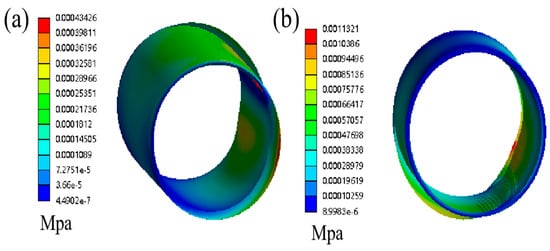 Figure 9 illustrates the stress distribution within a laminated water-lubricated bearing. This analysis uses equal layer thicknesses of 5 mm for both Liner 1 and Liner 2, an eccentricity ratio of 0.5, and a rotational speed of 200 r/min. As depicted in Figure 9a, a localized region of elevated stress appears on the outer surface of Liner 1. The maximum equivalent stress is 0.43426 kPa. Conversely, Figure 9b indicates that Liner 2 experiences a higher maximum equivalent stress of 1.13121 kPa. However, the overall stress distribution in Liner 2 remains relatively uniform, without significant stress concentration. This phenomenon results from the asymmetric wedge-shaped water film formed by shaft rotation under eccentric loading. The film generates coexisting regions of positive and negative pressure circumferentially. In the positive-pressure region, hydrodynamic pressure transmits normal loads across the interface and superimposes tangential frictional stresses. This combination causes localized increases in stress. In contrast, the negative-pressure region exhibits substantially reduced stress levels. Differences in material properties also influence this behavior. Liner 1 is characterized by a low elastic modulus and a high Poisson’s ratio. As a result, it undergoes considerable elastic deformation under localized loading, leading to stress concentration. In comparison, Liner 2 possesses greater stiffness. Although its peak stress surpasses that of Liner 1, the stress gradient is mild. This promotes a more uniform stress distribution and effective load transfer. Consequently, Liner 1 is more susceptible to localized stress concentration, whereas Liner 2 facilitates stress homogenization. These differences underscore distinct structural response characteristics between the two materials.