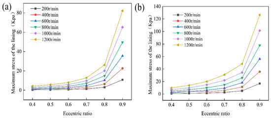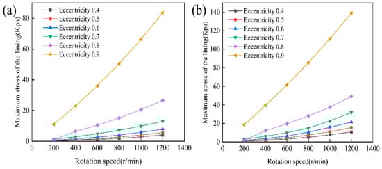 Figure 10 depicts the effect of eccentricity on the maximum stress observed in a laminated water-lubricated bearing. The findings indicate that, at a constant rotational speed, the maximum stress in both Liner 1 and Liner 2 increases as eccentricity rises. When eccentricity remains below 0.8, the stress increment is approximately linear and relatively gradual. However, beyond this threshold, the rate of increase accelerates markedly. For a given material, the disparity in stress across varying rotational speeds becomes more pronounced as the speed increases. At a fixed eccentricity, the maximum stress also escalates with rotational speed. Below 600 r/min, the increase is moderate, whereas above 600 r/min, the growth trend intensifies significantly. A comparative analysis further reveals that the maximum stress in Liner 2 consistently exceeds that in Liner 1 by a substantial margin. This indicates a higher load-carrying stiffness in Liner 2. This phenomenon can be explained by the sequence of load transmission and energy dissipation mechanisms within the system. The mechanical load generated by shaft rotation initially acts upon the hydrodynamic water film at the inner surface. Here, a portion of the energy dissipates through fluid viscous shear. The residual load is then transferred to Liner 1, which, due to its viscoelastic properties, dissipates additional energy through stress–strain hysteresis and internal friction resulting from molecular chain segment motion. This reduces the load transmitted to the underlying layer, helping to mitigate stress concentration. The attenuated energy is subsequently conveyed to Liner 2. The UHMWPE layer further absorbs and dissipates energy due to its high stiffness and intrinsic structural damping characteristics. Consequently, the system establishes a three-tiered energy attenuation mechanism. This comprises fluid damping, viscoelastic damping in Liner 1, and structural damping in Liner 2 [,].