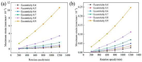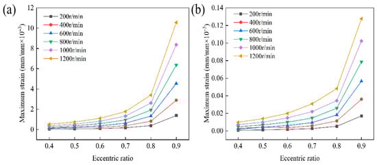 The influence of eccentricity on the maximum strain: (a) Lining 1; (b) Lining 2.