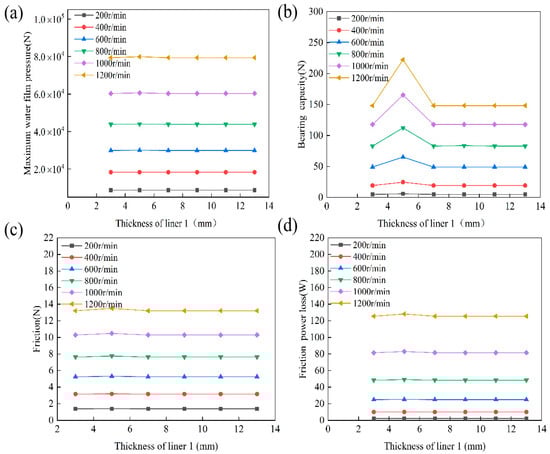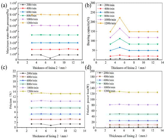 The influence of the thickness of the lining 2 on various parameters: (a) The maximum water film pressure; (b)The bearing capacity; (c) The friction force; (d) The friction power loss.