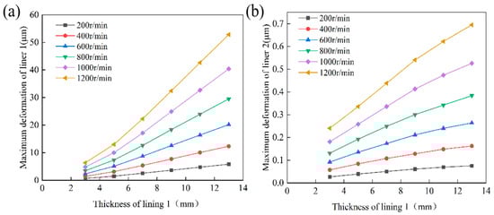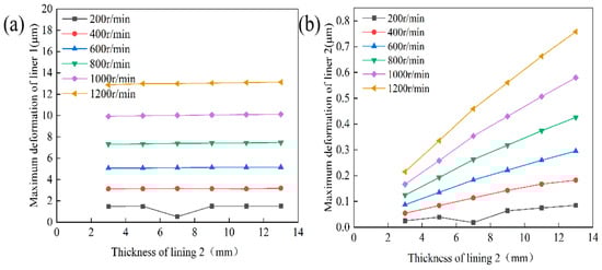 Figure 22a,b depict the effect of variations in the thickness of liner 2 on the maximum deformation of both liner 1 and liner 2. The conditions are an eccentricity of 0.8 and a fixed linear 1 thickness of 5 mm. The findings reveal that the maximum deformation of liner 1 is minimally affected by changes in the thickness of liner 2. At 800 r/min, the deformation of liner 1 rises only slightly from 7.3203 μm at 3 mm liner 2 thickness to 7.4566 μm at 13 mm. This change reflects a 1.86% increase. At 1200 r/min, the increase is 3.58%. In contrast, rotational speed has a much greater impact. When the liner 2 thickness is held at 5 mm, the maximum deformation of liner 1 increases from 1.14818 μm at 200 r/min to 12.985 μm at 1200 r/min. This change represents an 8.76-fold increase. At 200 r/min, a local minimum in linear 2 deformation is observed at a thickness of 7 mm. This may result from incomplete development of hydrodynamic pressure effects at low speeds. Maximum deformation of liner 2 is highly sensitive to both thickness and speed. At 800 r/min, liner 2 deformation rises from 0.12451 μm at 3 mm to 0.42604 μm at 13 mm—a 242.2% increase. At 1200 r/min, the increase is 252.6%. Under constant thickness, liner 2’s maximum deformation increases by a factor of 8.5 to 8.9 as rotational speed rises from 200 to 1200 r/min. Despite substantial relative deformation, liner 2 still displays significantly lower absolute deformation than liner 1. This is due to its higher structural stiffness, which limits its contribution to overall system deformation. In summary, within the examined thickness range, the deformation of liner 1 is primarily governed by material properties and rotational speed. In contrast, liner 2 responds to variations in thickness and speed, while maintaining low absolute deformation and minimal influence on the total system deformation.