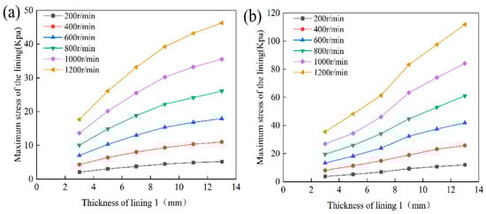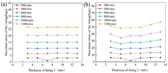 The influence of the thickness of the liner 2 on the maximum stress: (a) Lining 1; (b) Lining 2.