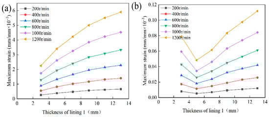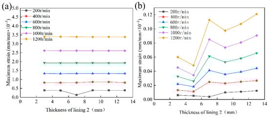 The influence of the thickness of the liner 2 on the maximum strain: (a) Lining 1; (b) Lining 2.