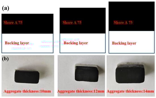 The surface layer Liner 1 was a rubber-based composite of nitrile butadiene rubber, UHMWPE, solid lubricants, and additives. It was prepared by melt blending, compression molding, and vulcanization using a hydraulic hot press. Hardness was adjusted by varying the ratios of carbon black and curing agent, while thickness depended on the mold cavity size. Specimens had a Shore A hardness of 75 and nominal dimensions of 15.5 mm × 6.5 mm, with thicknesses of 5 mm, 7 mm, and 9 mm. Meanwhile, the backing layer Liner 2 was made from UHMWPE supplied by Shandong Ningjin Mingyang New Materials Co., Ltd. (Dezhou City, China). It was machined into 15.5 mm × 6.5 mm × 5 mm blocks using a CNC lathe. Following this, a two-part epoxy adhesive was applied after surface activation, and the layers were bonded together under heat and pressure. As a result, the resulting laminates had total thicknesses of 10 mm, 12 mm, and 14 mm, corresponding to surface layer thicknesses of 5 mm, 7 mm, and 9 mm, respectively. Finally, the counter-body material used in the tests was a tin bronze alloy, ZCuSn10Zn2. Figure 25 illustrates the specimen configuration.