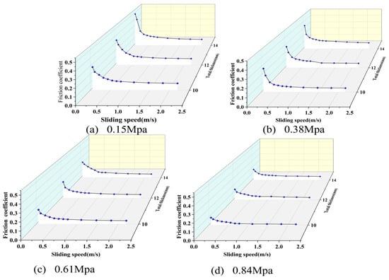 Changes in the friction coefficient of laminated structures under various loading ratios: (a) 0.15 Mpa; (b) 0.38 Mpa; (c) 0.61 Mpa; (d) 0.84 Mpa.