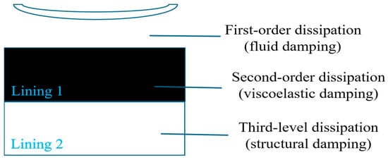 In laminated water-lubricated bearings, energy transmission and dissipation occur in three stages—fluid damping, viscoelastic damping in the flexible rubber liner, and structural damping in the backing layer. Figure 28 illustrates this sequence. Under hydrodynamic pressure, the fluid film carries the primary load. It converts part of the mechanical input into heat through viscous shear, which the lubricant flow removes. The undissipated energy is transferred to the flexible liner, Liner 1, where molecular chain friction and stress–strain hysteresis, both characteristic of viscoelastic materials, further attenuate it. Remaining energy passes to the backing liner, Liner 2. Here, secondary dissipation happens through structural damping. External operating conditions mainly govern the energy input. Increasing eccentricity reduces the minimum film thickness and elevates the peak hydrodynamic pressure. This intensifies the energy influx. Increasing rotational speed causes a steady rise in film pressure and frictional power. At high speeds, this rise shows a convex trend and markedly enhances overall system dissipation.