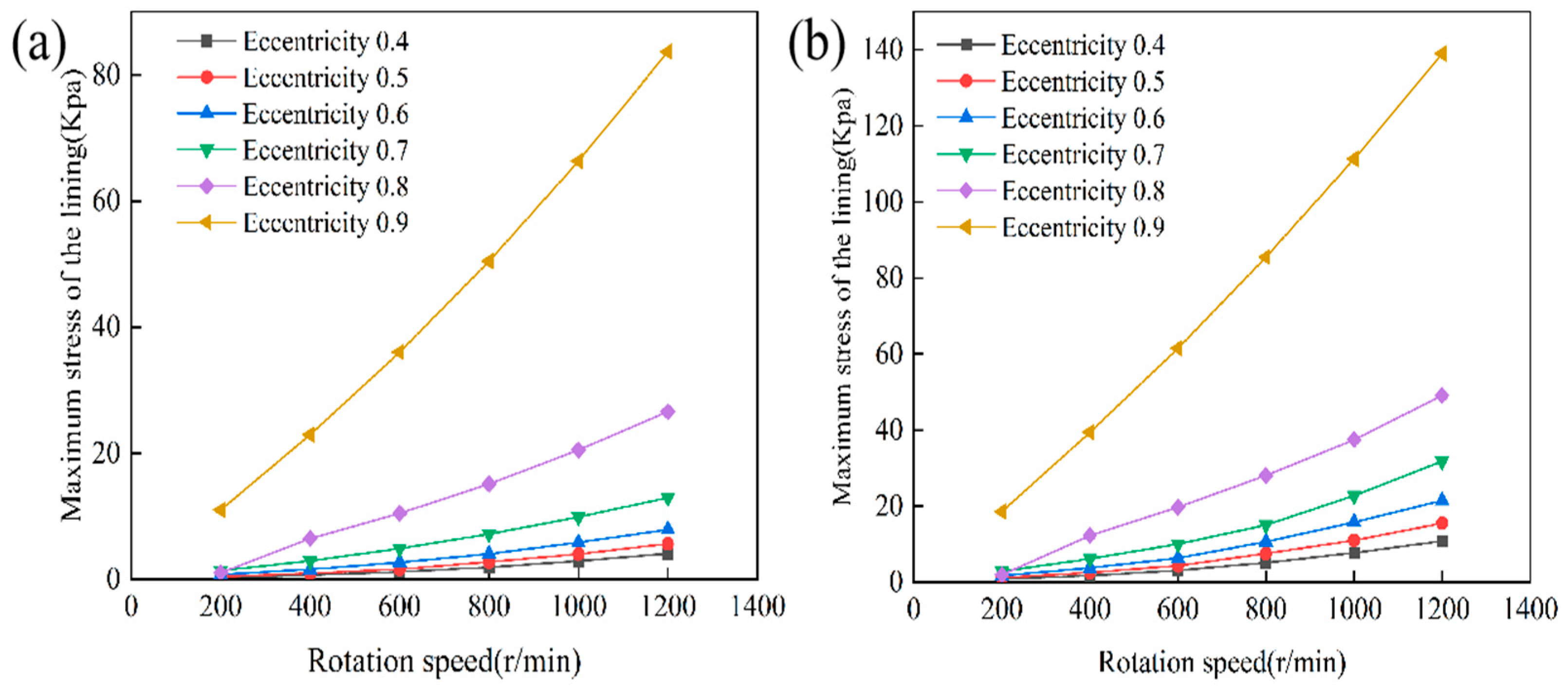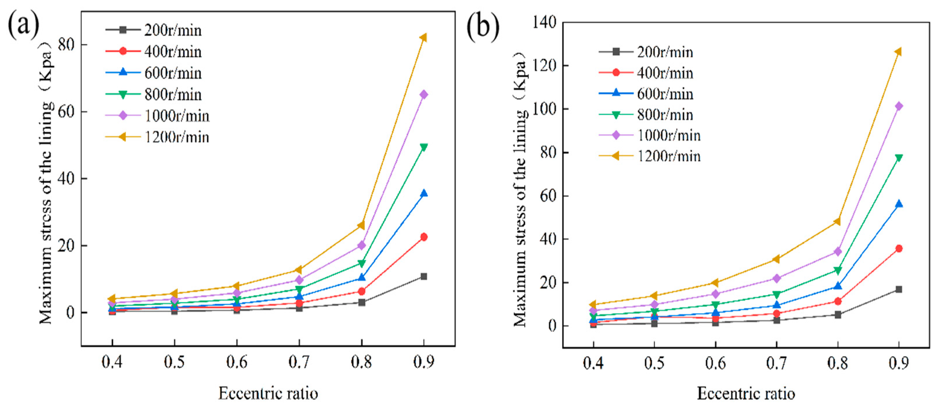 - Eccentricity and rotational speed are the primary factors influencing lubrication performance and structural response. Increasing eccentricity reduces the minimum film thickness but enhances the hydrodynamic effect. This results in a higher maximum water film pressure and enhances load-carrying capacity. Higher rotational speed further strengthens the hydrodynamic effect. However, it also increases frictional power loss and the amplitude of structural response. The combined effects of eccentricity and speed make the system highly sensitive under high-eccentricity and high-speed conditions. These factors have a decisive influence on operational stability and energy efficiency.