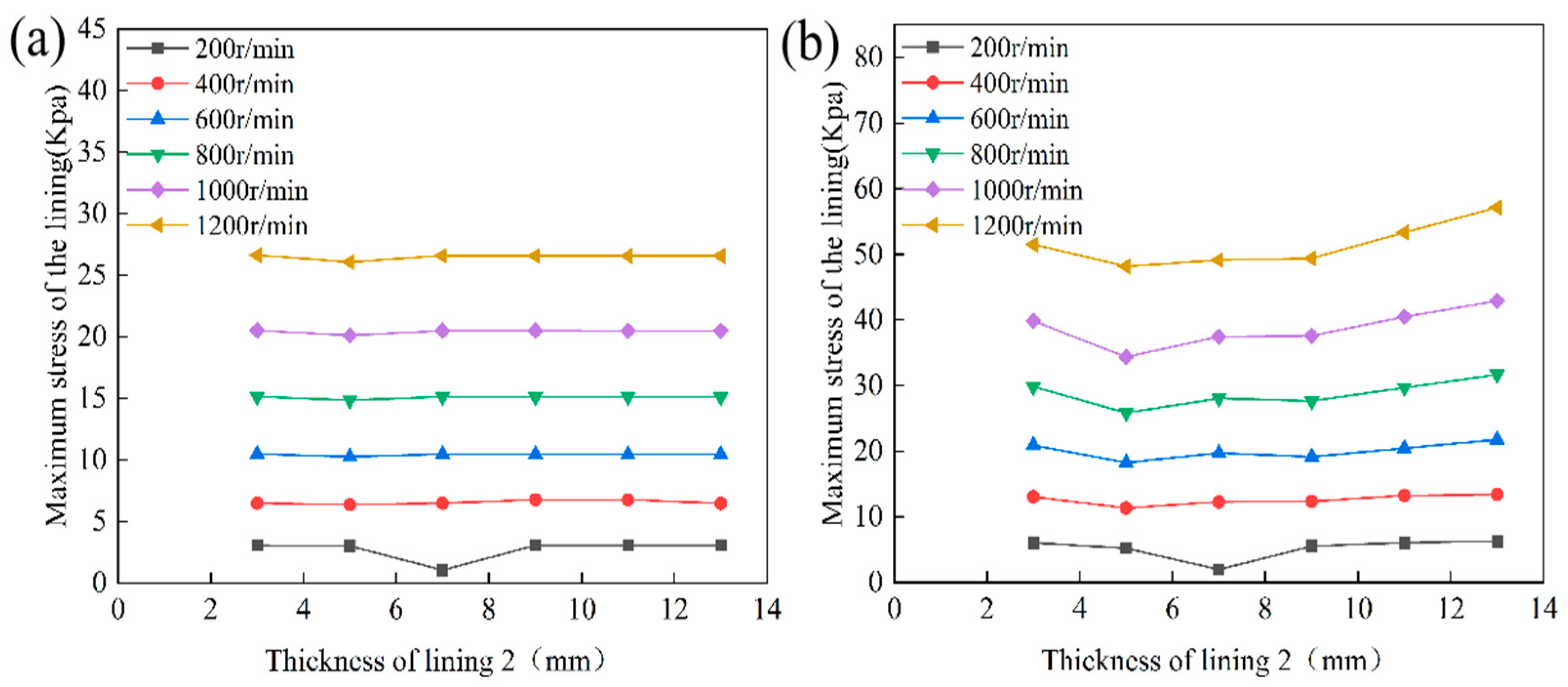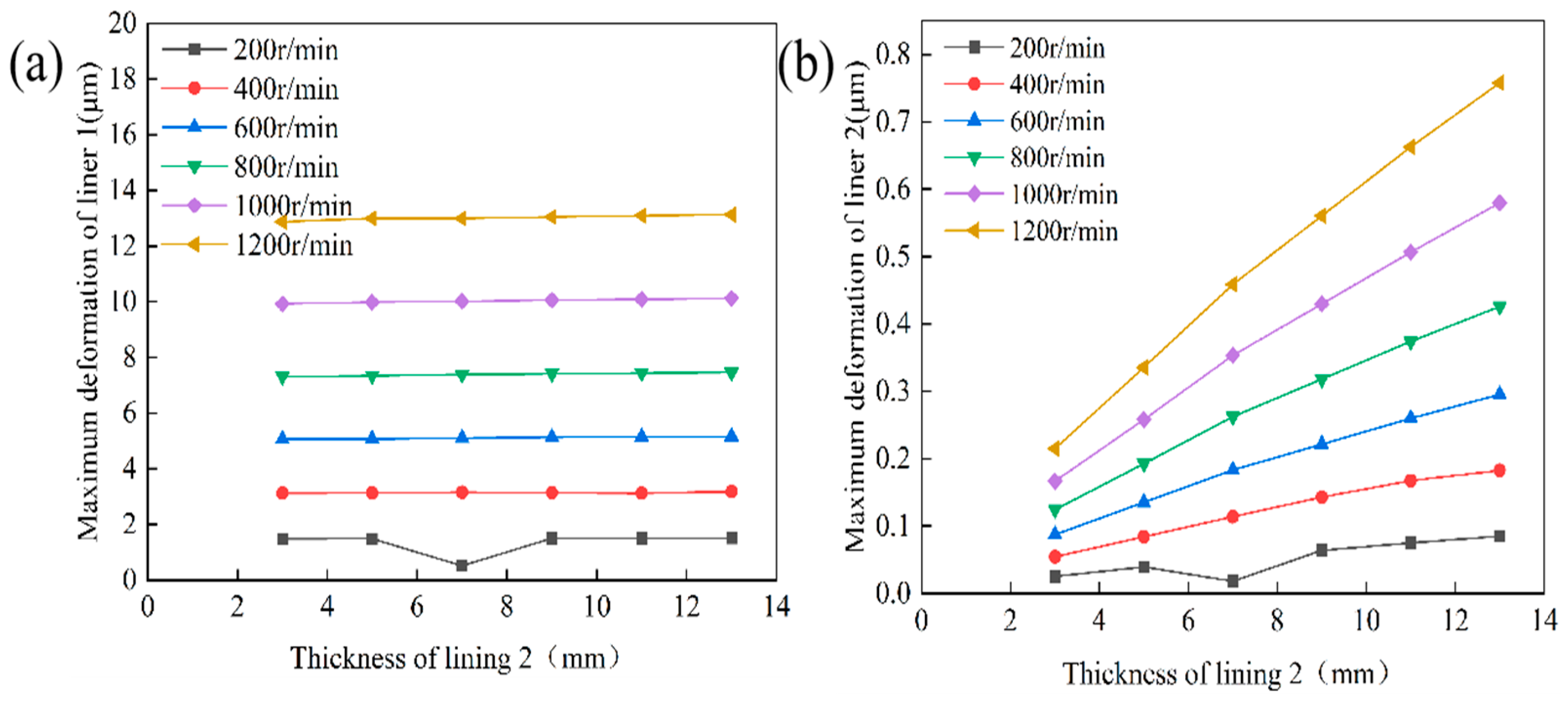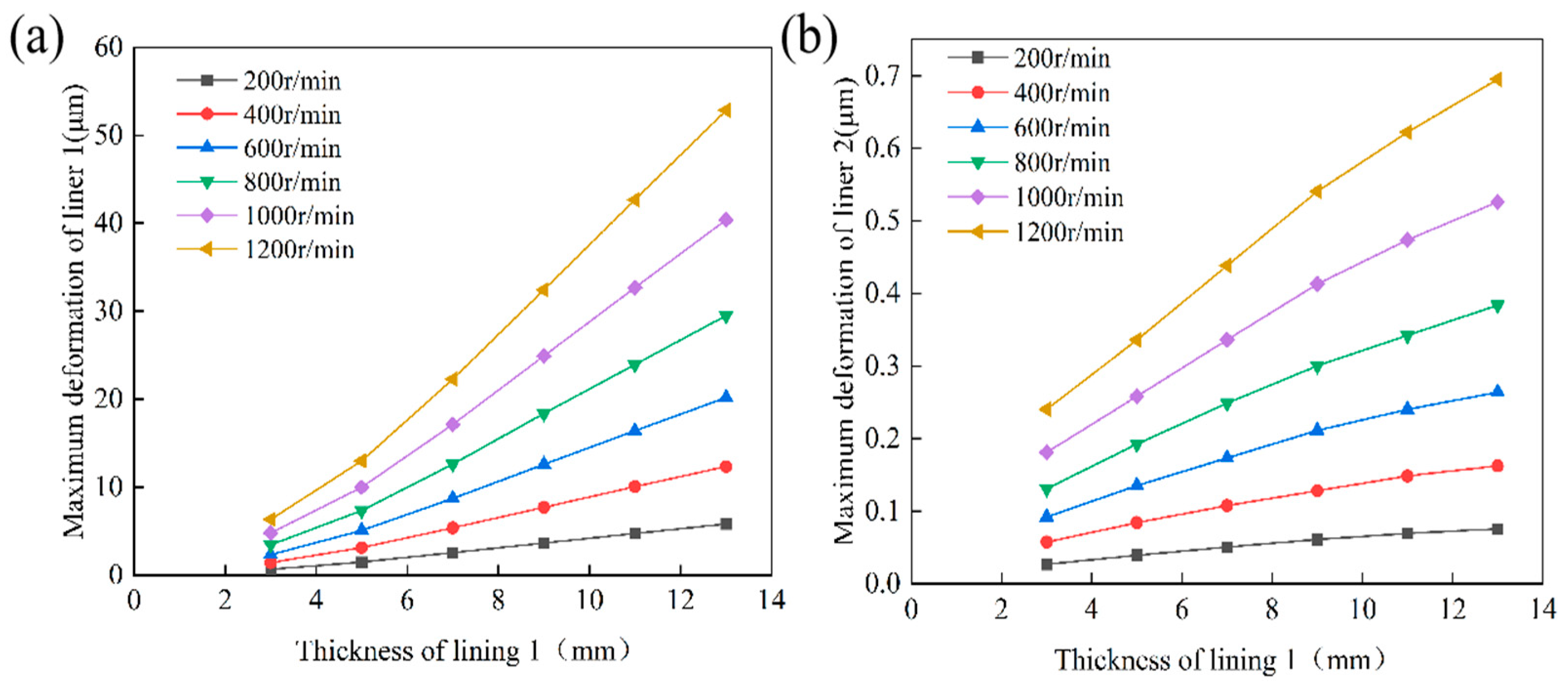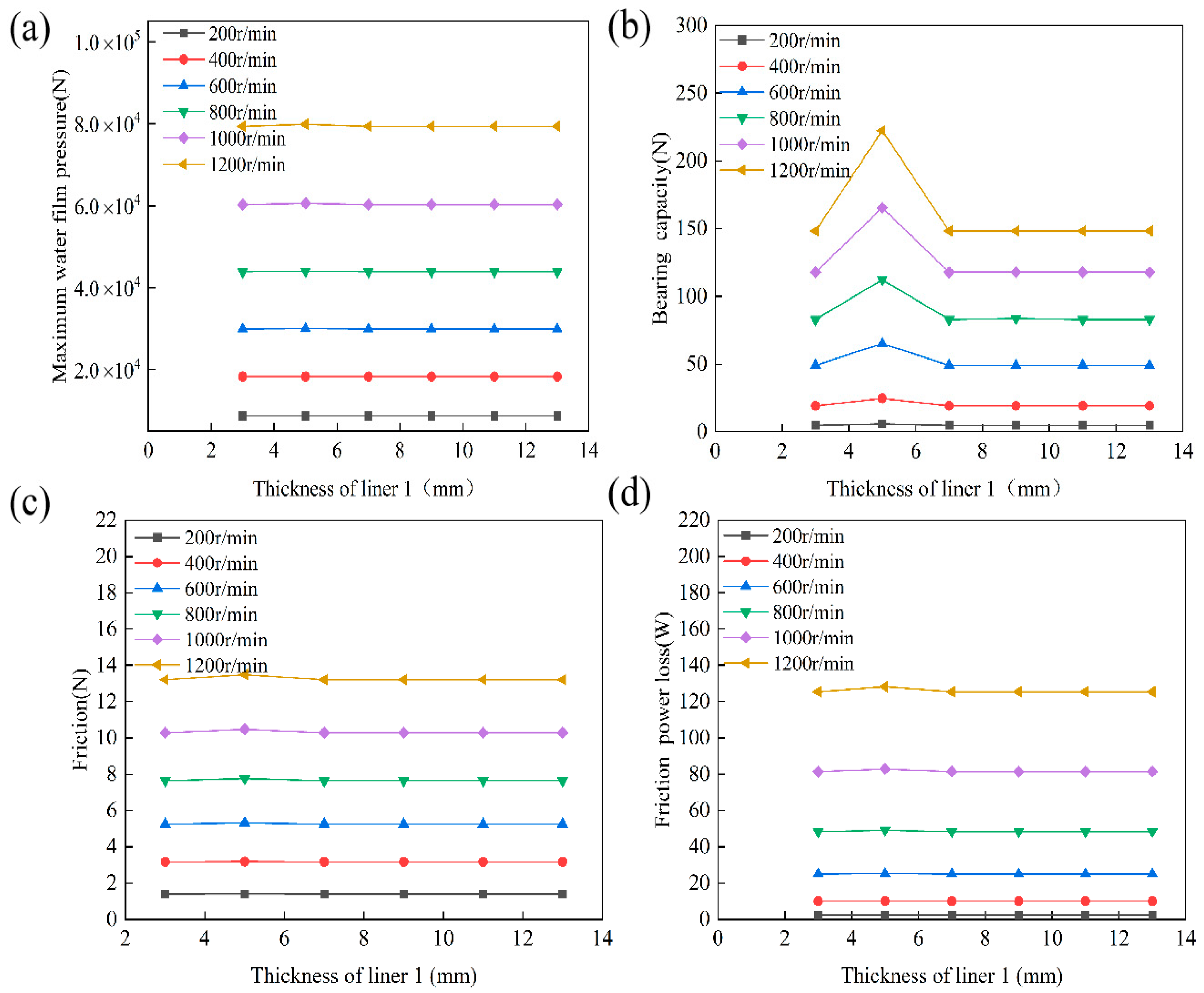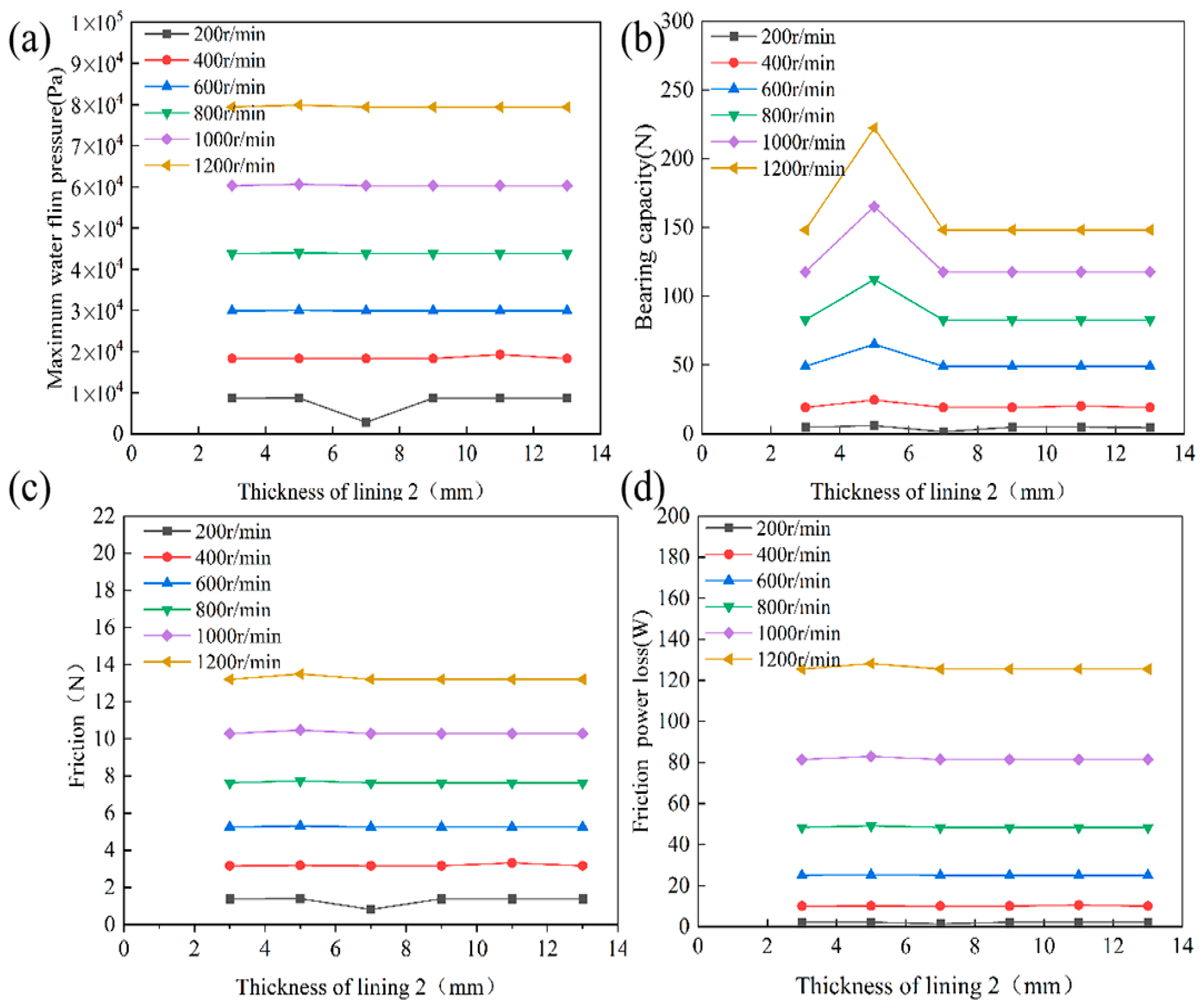 - The appropriate matching of liner layer thicknesses strongly affects load transfer and energy dissipation in the fluid film–liner 1–liner 2 system. Optimizing thickness uniformity improves pressure distribution and limits local stress. The viscoelastic hysteresis of the rubber layer and dual damping further boost energy dissipation. This results in improved load capacity and energy efficiency, particularly under high eccentricity and high speed conditions. The findings offer theoretical guidance and a framework for engineering laminated water-lubricated bearings.
