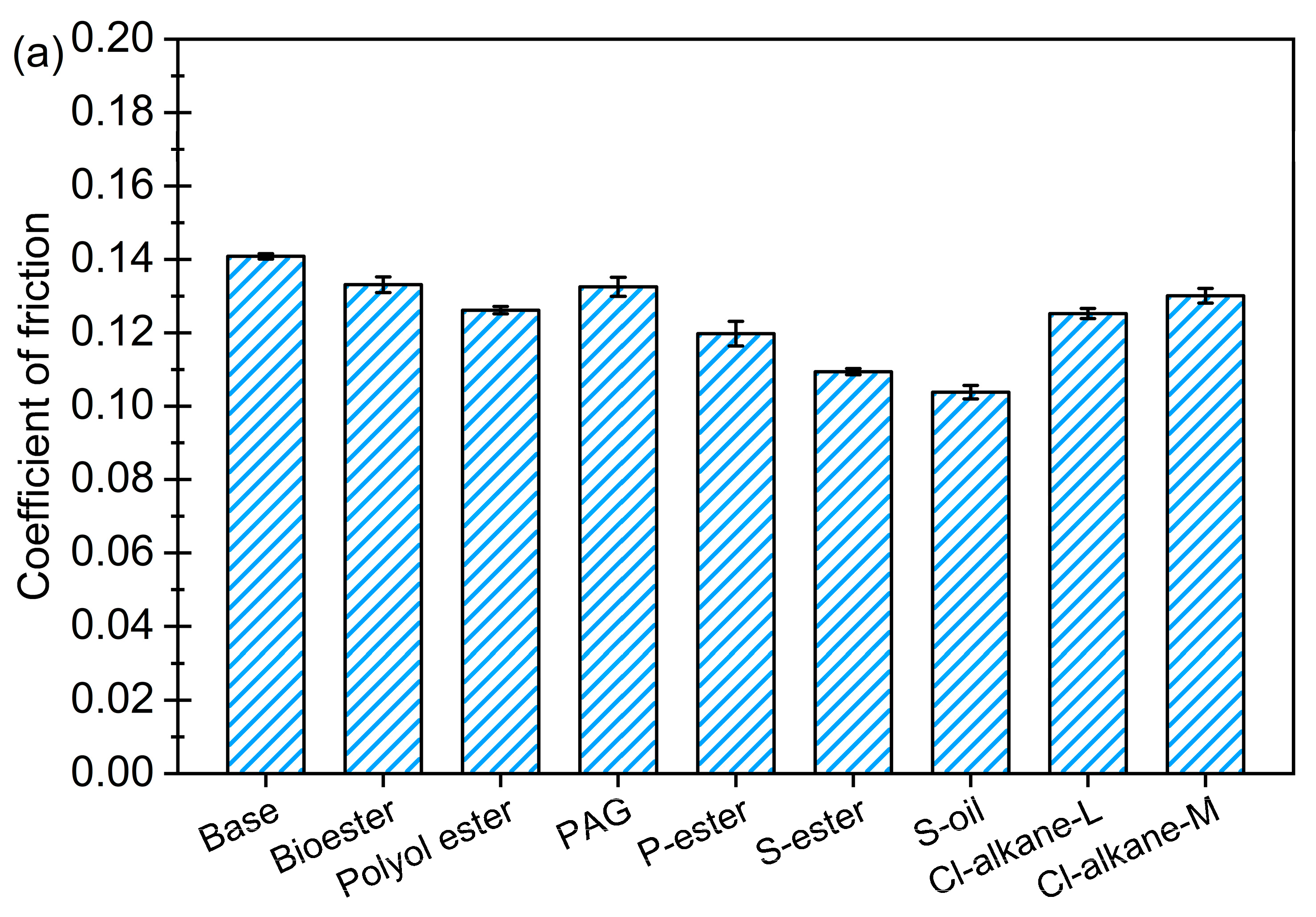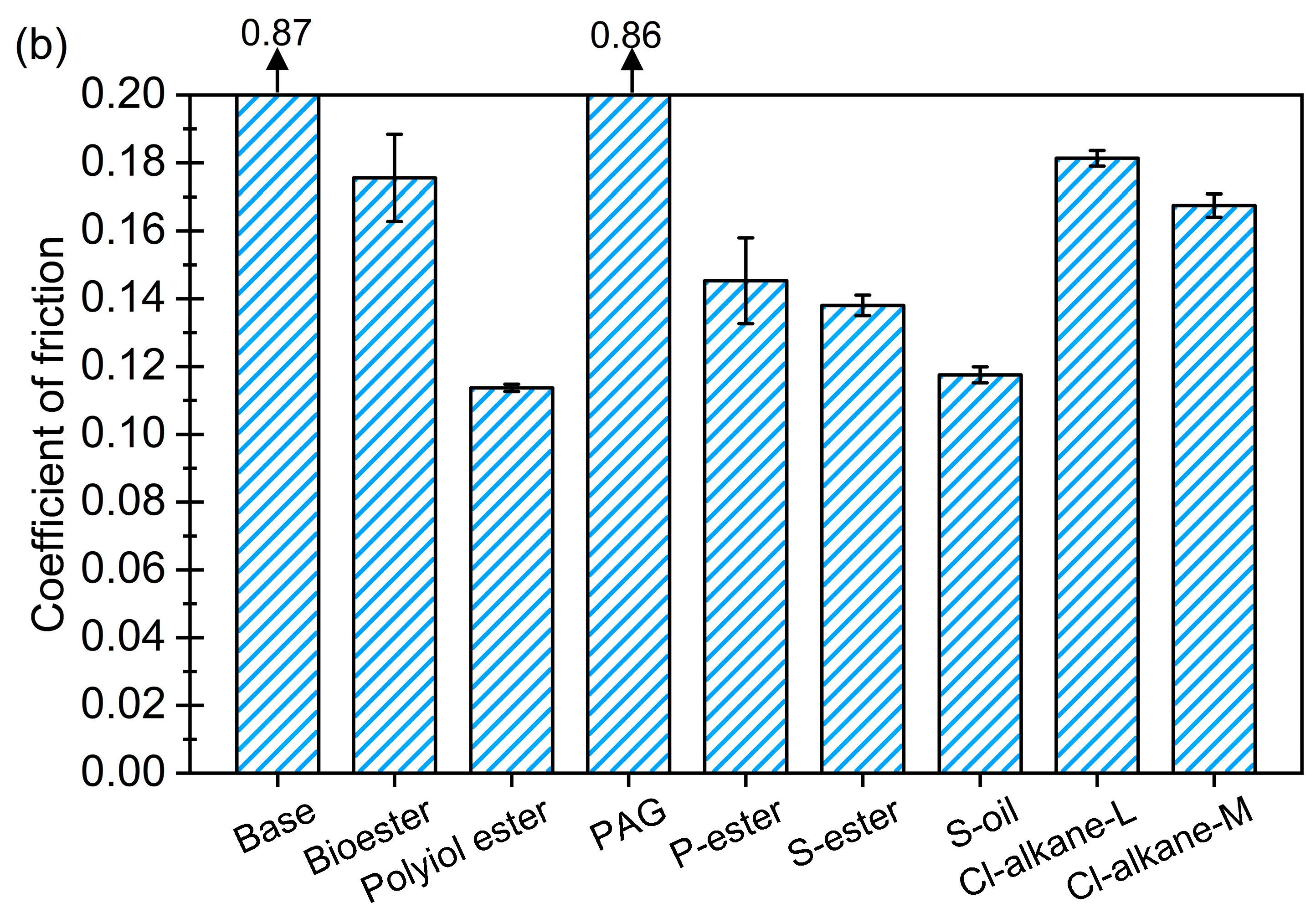 Figure 1 presents the steady-state coefficients of friction after 10 cycles (Figure 1a) and 10,000 cycles (Figure 1b). After 10 cycles (Figure 1a), noticeable differences already emerge between additive mixtures. In addition, all additives reduce the coefficient of friction compared to the pure base lubricant. The lowest values are observed for mixtures with S-oil (~0.10) and S-ester (~0.11), followed by the mixture with P-ester (~0.12). Mixtures with completely organic additives—polyol ester, PAG, and bioester—have similar coefficients of friction as the mixtures with chlorinated additives (Cl-alkane-L and Cl-alkane-M): namely, around 0.13.