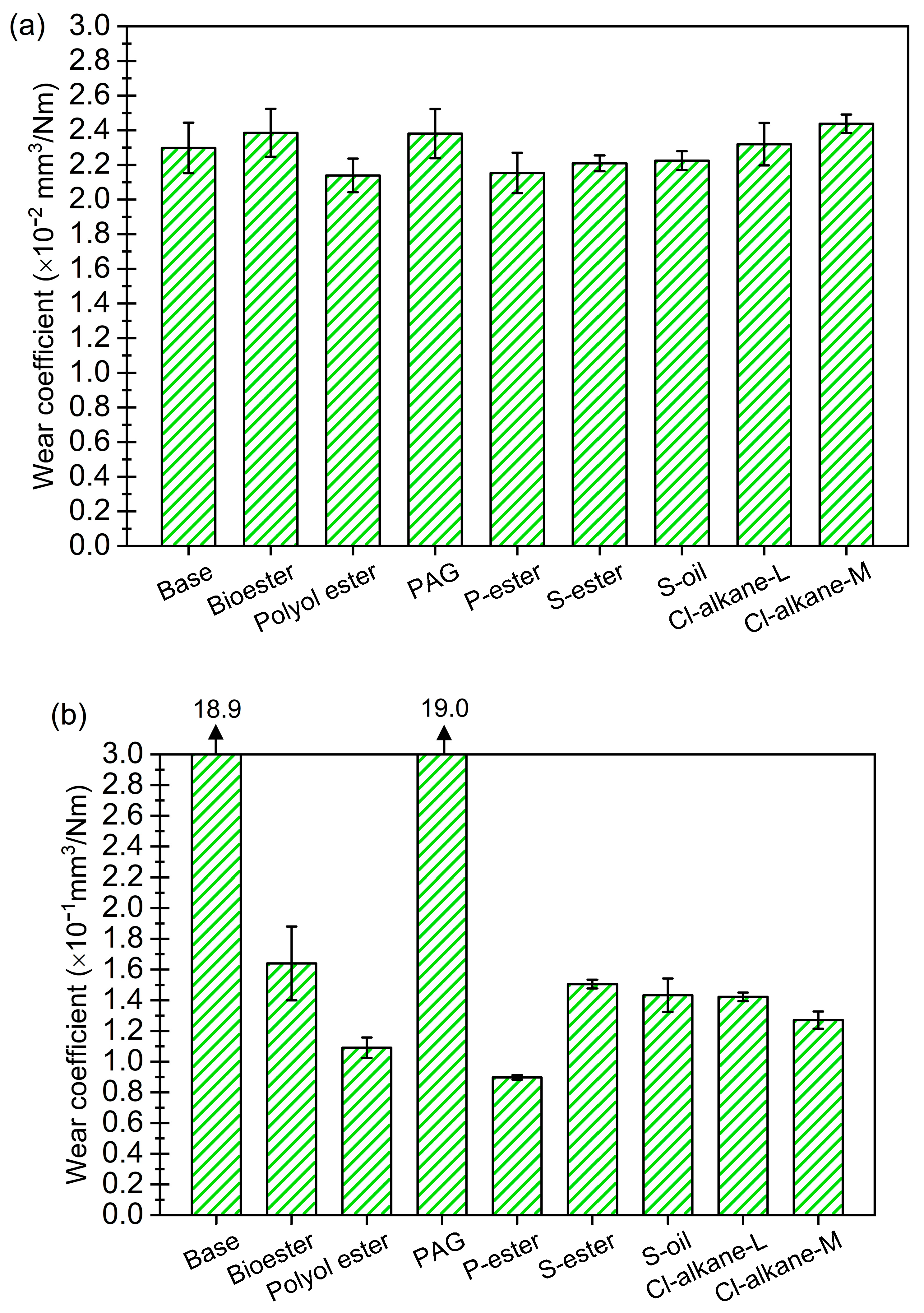 After 10 cycles (Figure 2a), there are no clear differences in the wear coefficient between the additive mixtures or the base lubricant. The differences become clear after 10,000 cycles (Figure 2b), where the lowest wear coefficient was observed for the mixture with P-ester (~0.9 × 10−1 mm3/Nm), followed by the mixture with polyol ester (~1.1 × 10−1 mm3/Nm). Mixtures with sulphurised and chlorinated additives exhibit similar anti-wear properties, with the wear coefficient ranging from ~1.3 × 10−1 mm3/Nm for Cl-alkane-M to ~1.5 × 10−1 mm3/Nm for S-ester. Lubricity additives (bioester and PAG) show the poorest anti-wear performance, with a particularly high wear coefficient observed for PAG (~19.0 × 10−1 mm3/Nm).