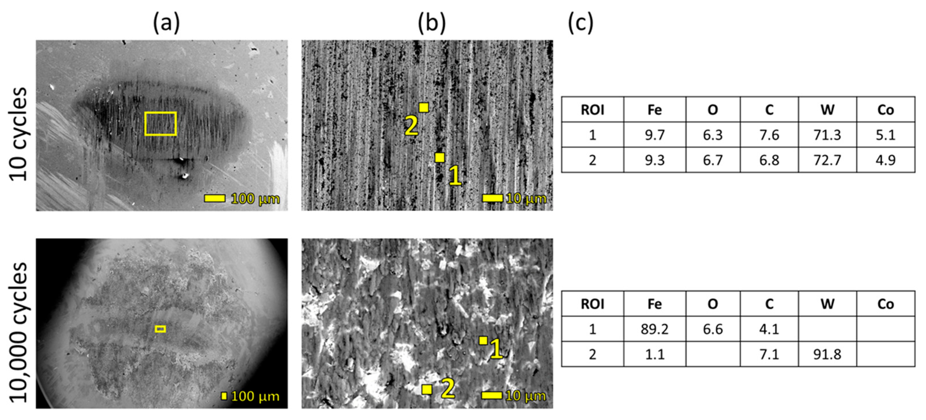 Figure 3 shows SEM images of the contact area on a WC-Co ball after the 10 and 10,000 cycle tests with the base lubricant. Panel (a) provides a low-magnification view of the overall contact area, while panel (b) offers a high-magnification view highlighting representative surface morphology, and panel (c) presents the corresponding EDS analysis of the selected regions in (b). Notably, an Fe transfer film was observed after only 10 cycles. This film appears smooth and aligned with the sliding direction. After 10,000 cycles, both the contact area and the Fe transfer film increase significantly. The film’s morphology also changes—it becomes multilayered and significantly rougher than the smoother film seen after only 10 cycles.