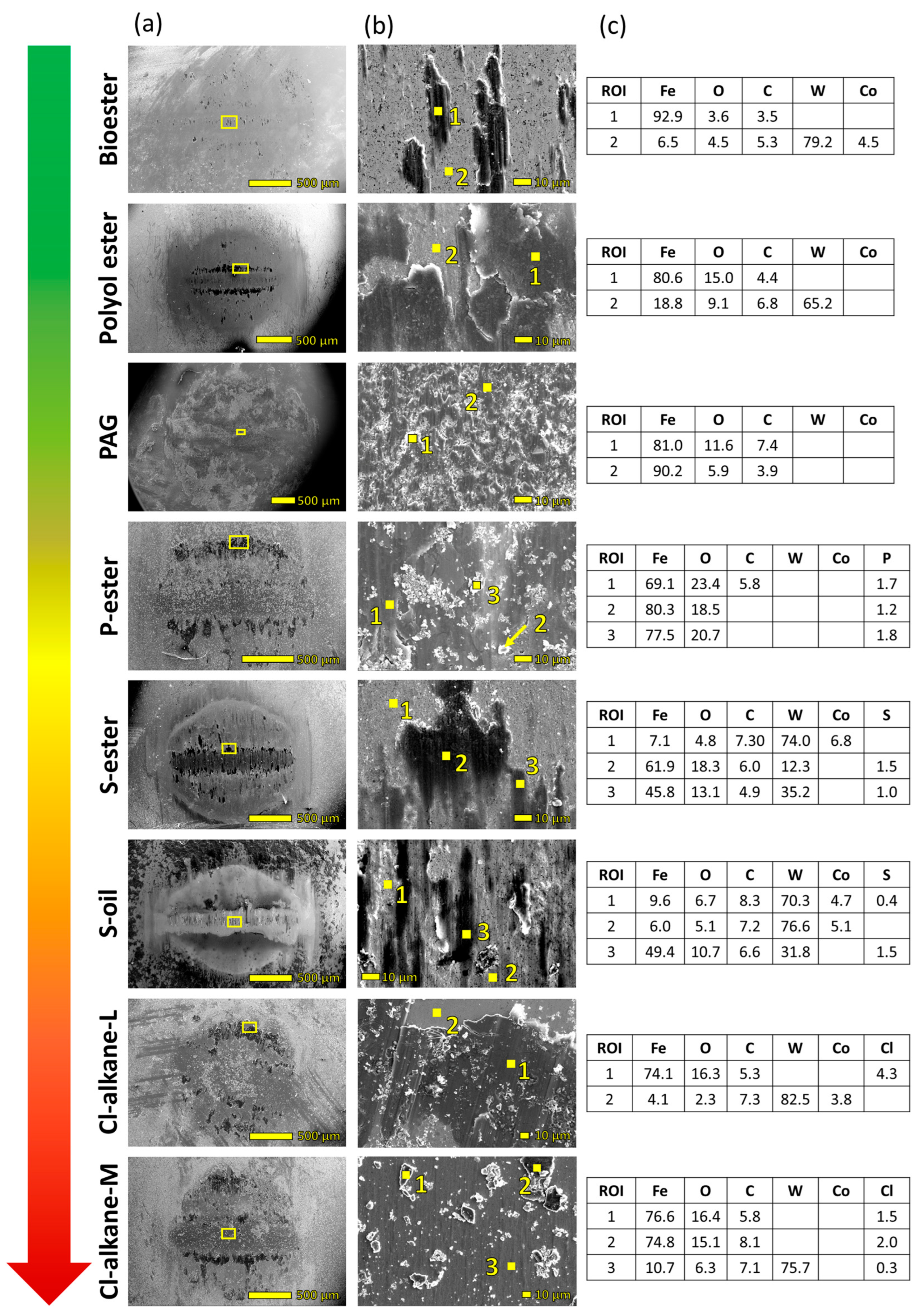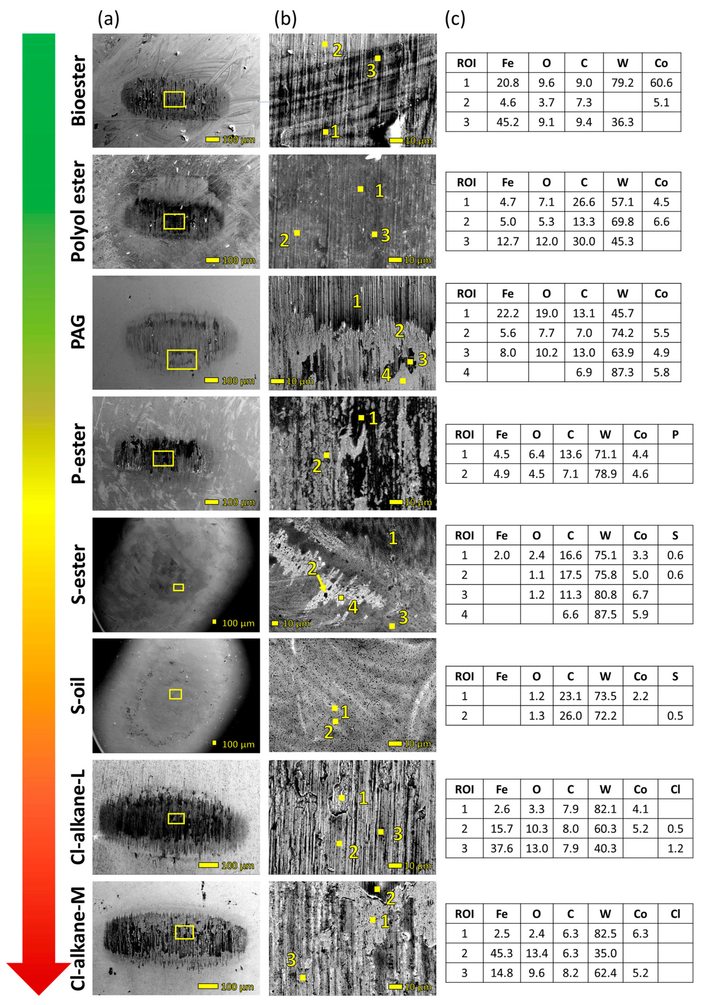 Figure 5 shows SEM images of the contact area on a WC-Co ball after a 10,000 cycle test in the presence of different additive mixtures. Panel (a) shows a low magnification view of the entire contact surface, while panel (b) shows a high magnification view, highlighting the representative surface morphology, and panel (c) shows the corresponding EDS analysis of the selected regions in (b). For all additive mixtures, the Fe transfer film was observed on the WC-Co ball, with the iron content generally decreasing as additive severity increases. The two environmentally acceptable mixtures, containing bioester and polyol ester additives, produce thick, Fe-rich stripes (80–93 wt%), although significant amounts of iron can also be detected outside of these regions (7–19 wt%). A mixture with the PAG additive has the largest contact area covered with a significant amount of Fe transfer film (81–90 wt%), reflecting both the morphology and the Fe content of the base lubricant (as seen in Figure 3). A mixture with the P-ester additive results in a uniform Fe transfer film over the entire contact area, with abundant wear debris. Phosphorus (P) was also detected over the entire contact area, indicating a well-distributed film formed by the additive. Mixtures with sulphurised additives (S-oil and S-ester) exhibit Fe film characteristics and a similar surface morphology to the most environmentally acceptable additives (bioester and polyol ester), but with lower iron concentrations (around 50–60 wt% on thick stripes/islands), and significantly less iron outside these regions (~6–10 wt%). The detection of sulphur (S) confirms the formation of an additive-derived tribofilm, although less uniformly than with P-ester. Mixtures with chlorinated additives behave differently: Cl-alkane-L forms Fe-rich islands (>70 wt% Fe) only at the edge of the contact area, whereby chlorine (Cl) was also detected on these islands. A minimal concentration of iron (<5 wt%) and no chlorine was observed outside those islands. In contrast, the mixture with the Cl-alkane-M additive shows a low overall amount of iron (~10 wt%), but a very high amount of iron (>70 wt%) on sharp wear particles within the contact area. Chlorine was detected on the entire contact area, indicating a more evenly distributed additive-derived tribofilm.