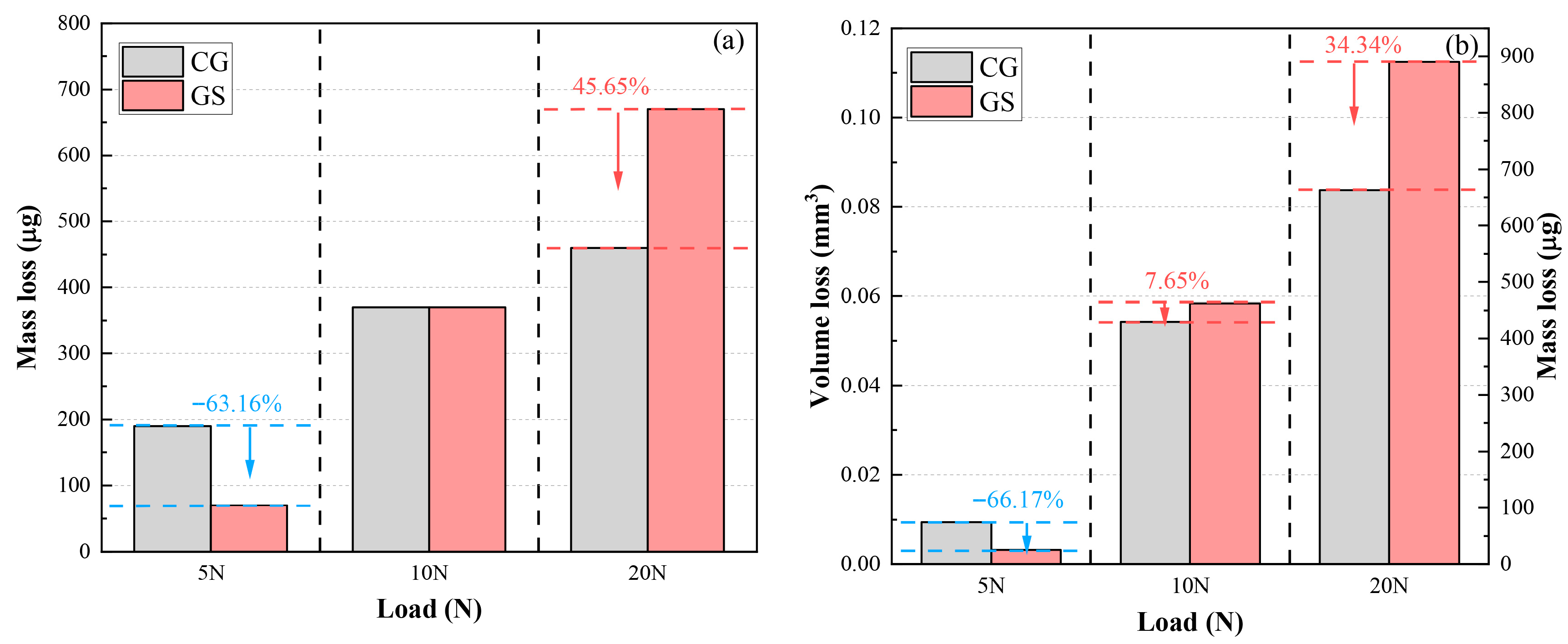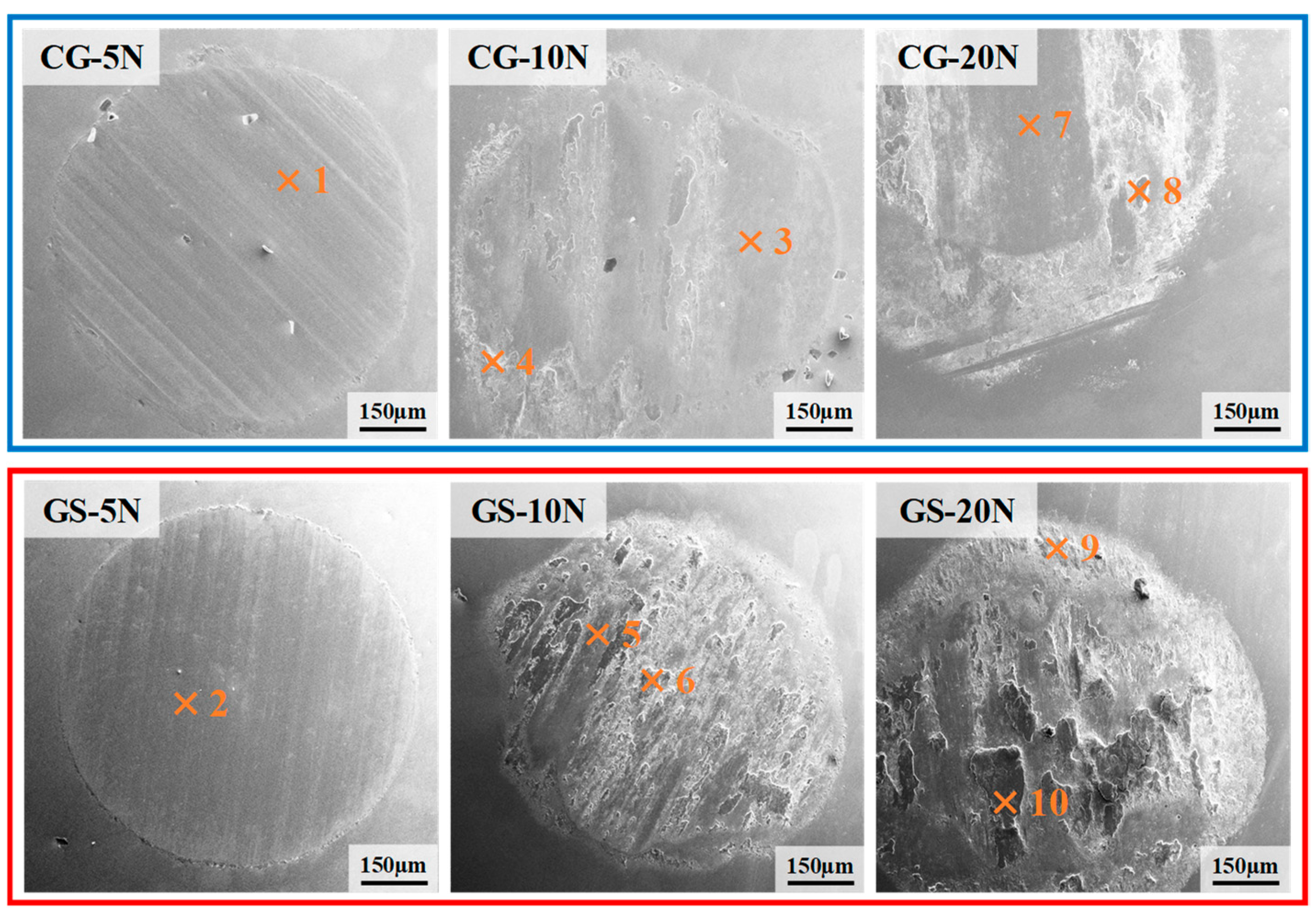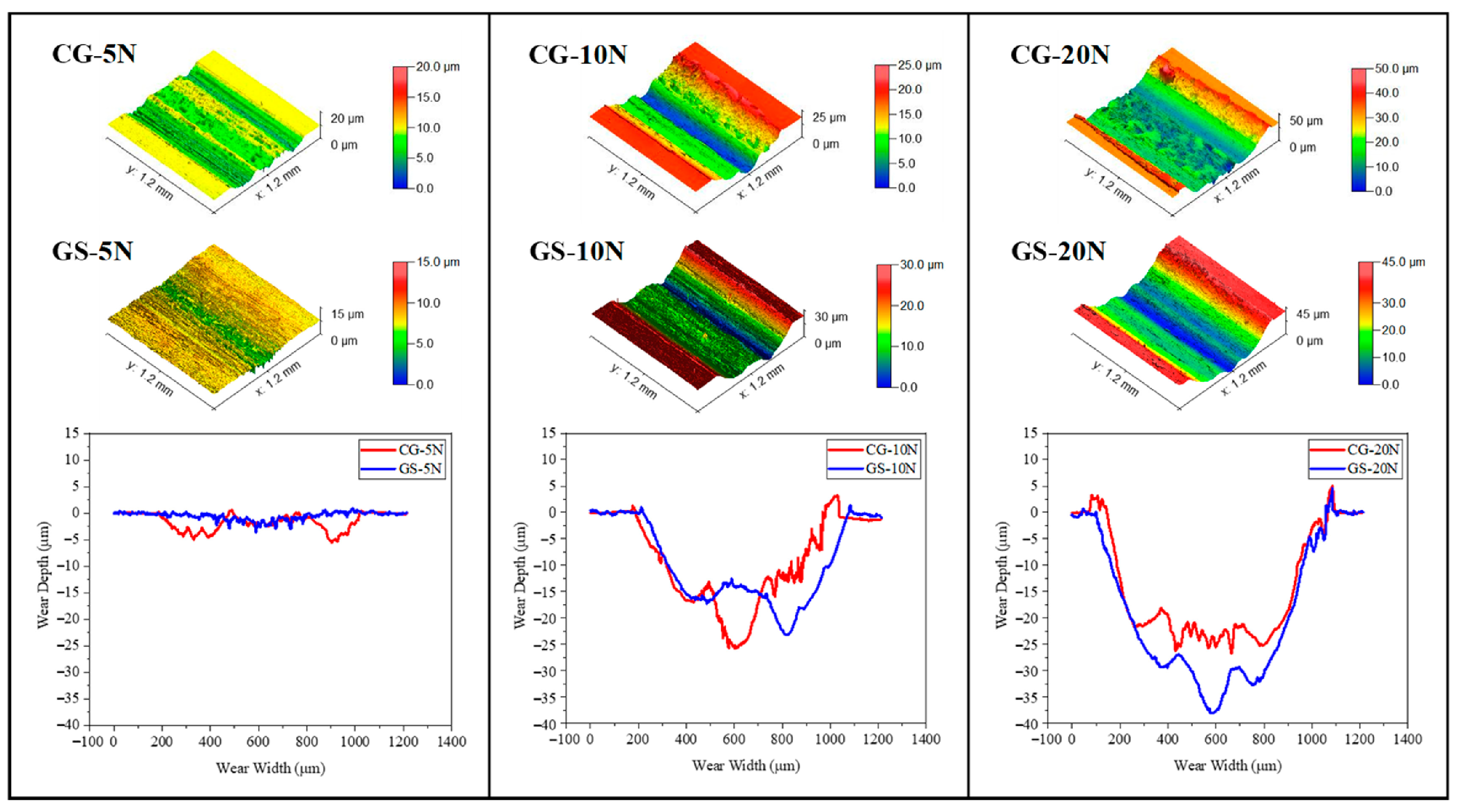 - The frictional behavior of the specimens exhibited distinct load-dependent characteristics. The coefficient of friction (COF) of the CG specimens initially decreased and then increased with rising normal load, whereas that of the GS specimens decreased continuously. This trend can be attributed to the progressive formation of protective oxide films at the sliding interface due to enhanced oxidative reactions.