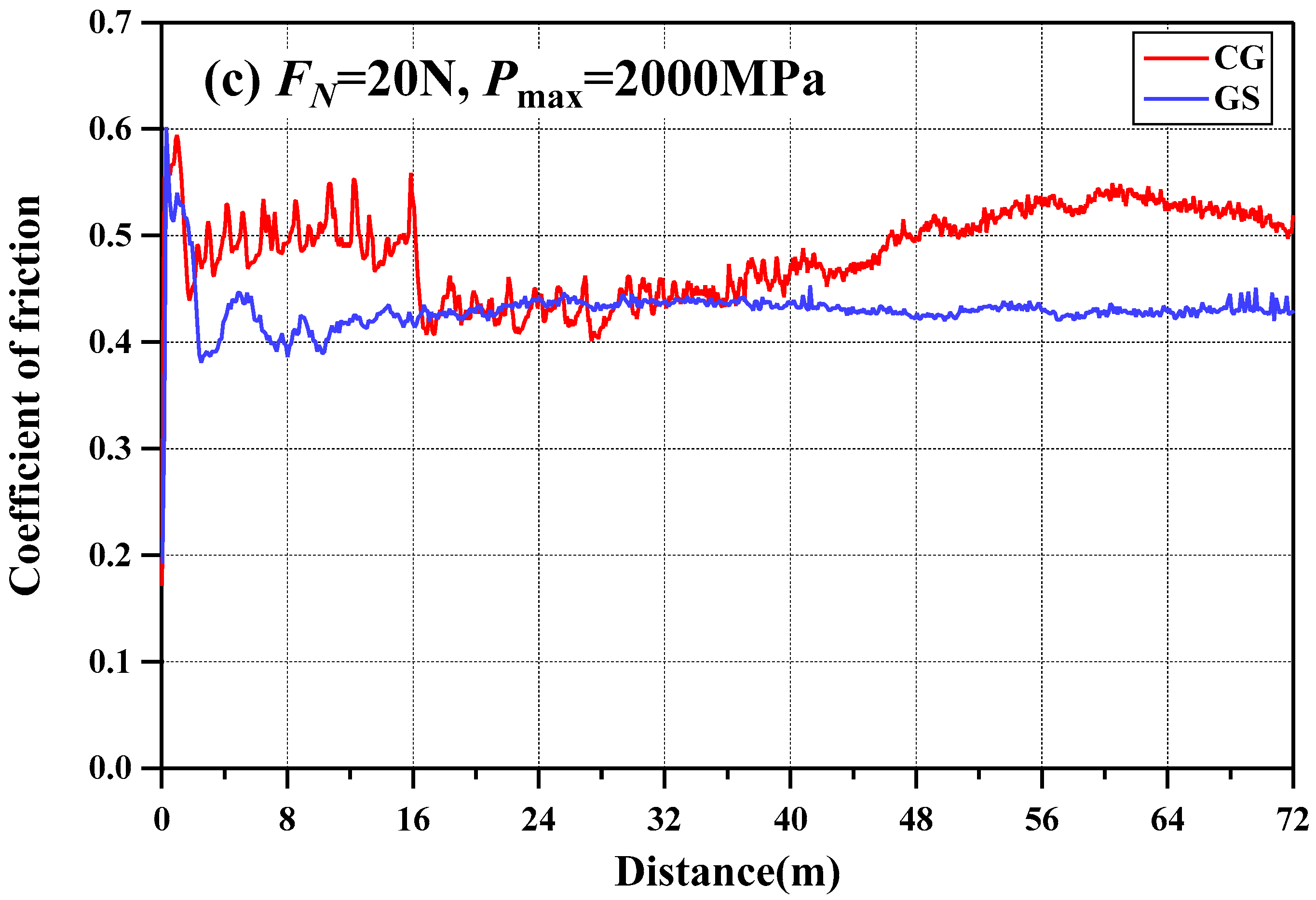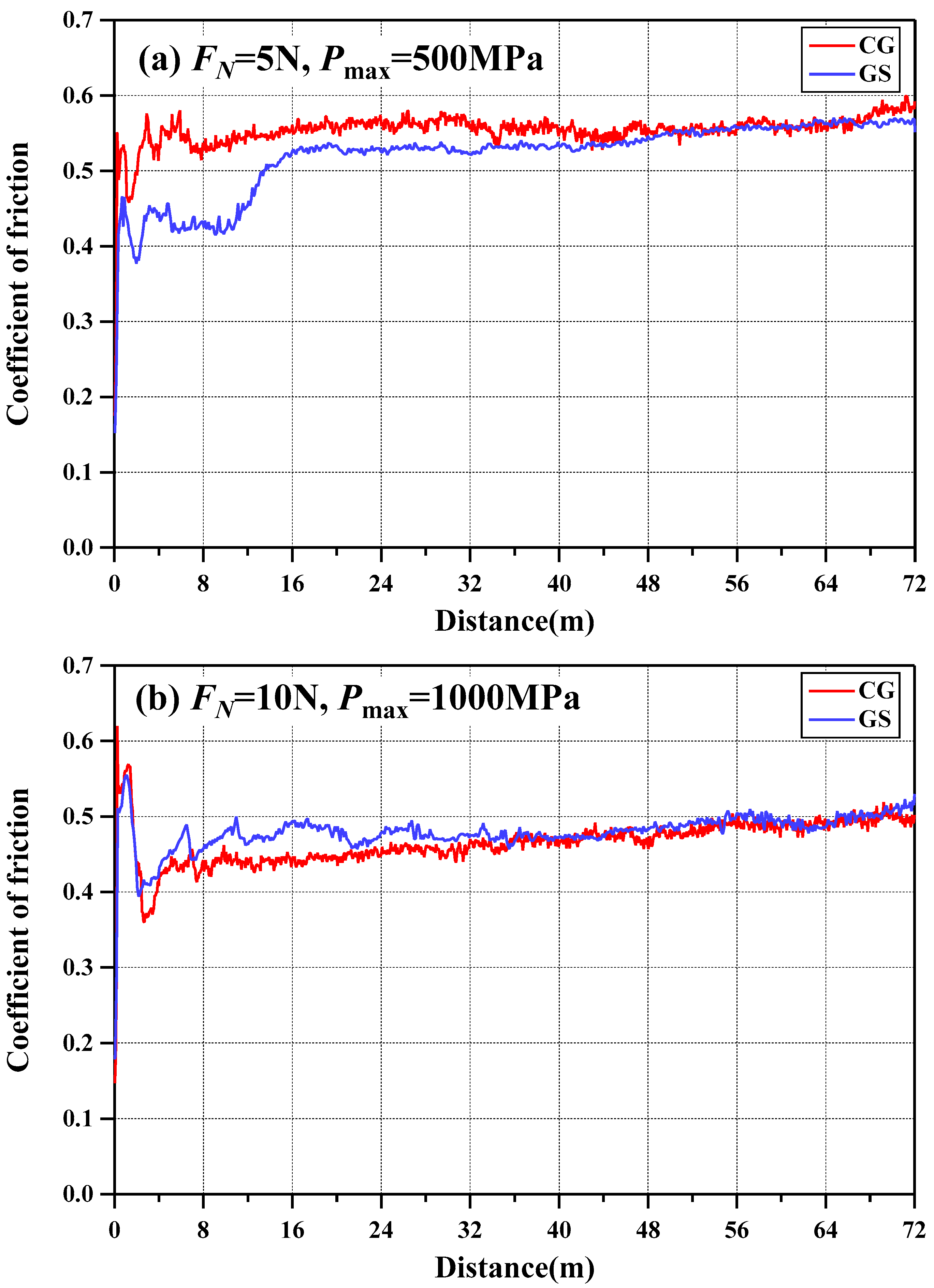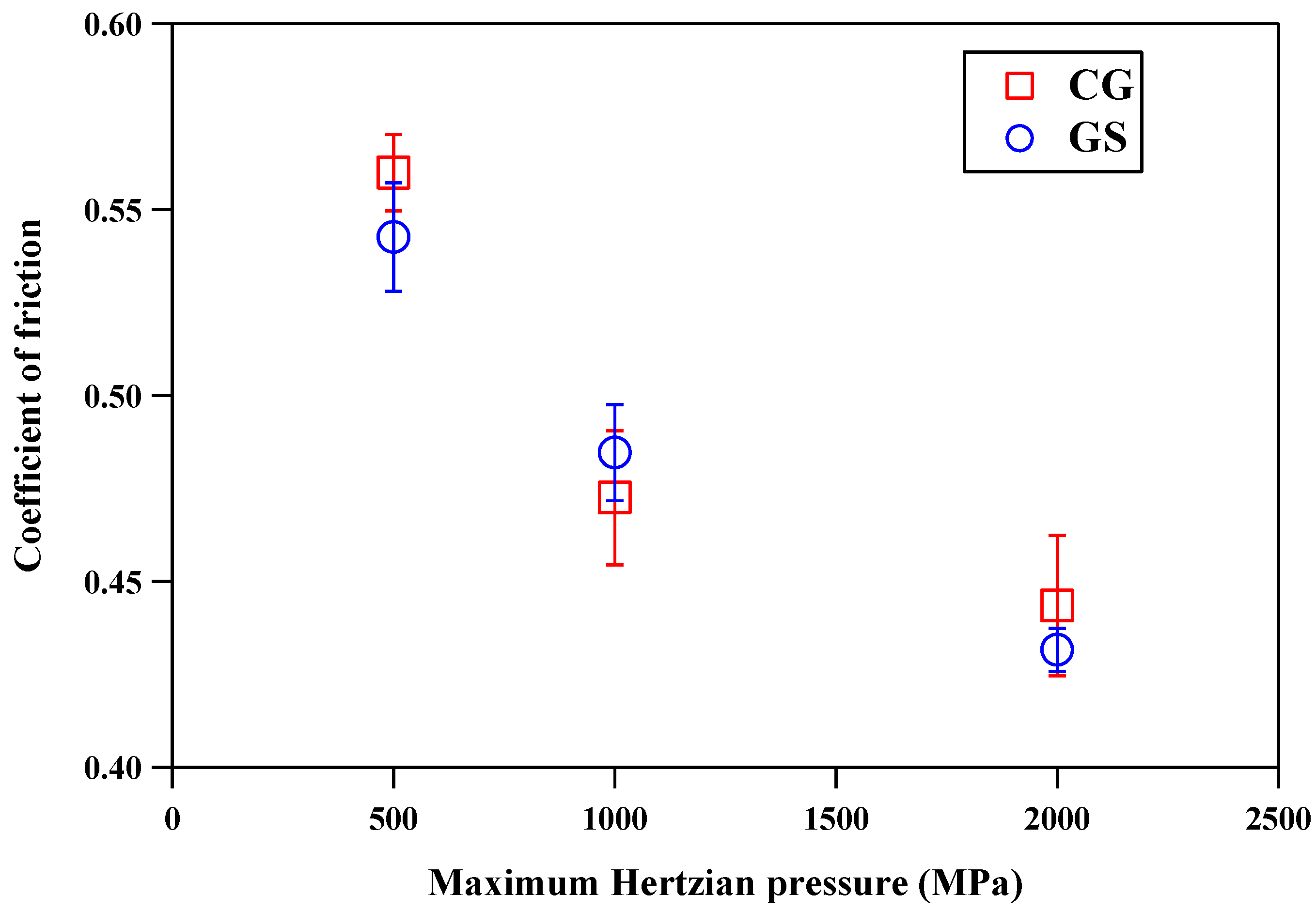 - The frictional behavior of the specimens exhibited distinct load-dependent characteristics. The coefficient of friction (COF) of the CG specimens initially decreased and then increased with rising normal load, whereas that of the GS specimens decreased continuously. This trend can be attributed to the progressive formation of protective oxide films at the sliding interface due to enhanced oxidative reactions.