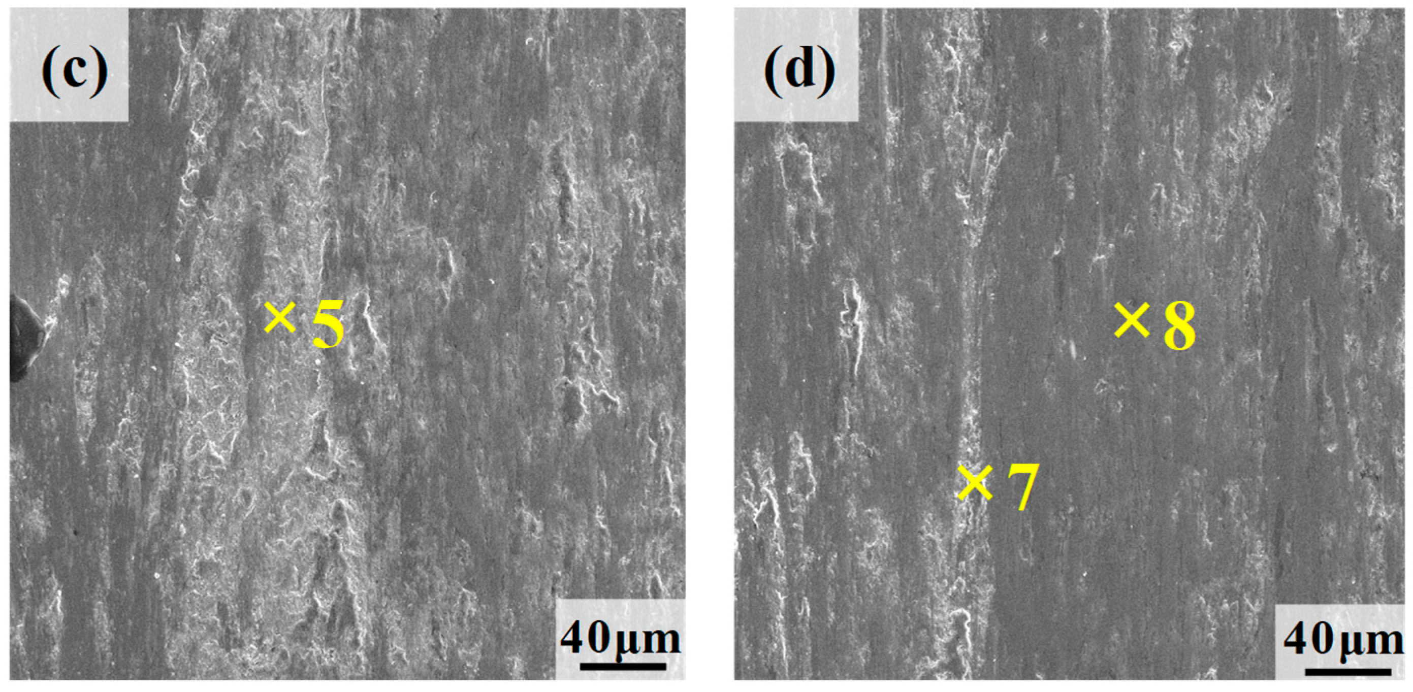 - Zou, Y.; Li, J.K.; Liu, X.; He, T.T.; Lu, J.S.; Li, D.L.; Li, Y. Effect of multiple ultrasonic nanocrystal surface modification on surface integrity and wear property of DZ2 axle steel. Surf. Coat. Technol. 2021, 412, 127012. [Google Scholar] [CrossRef]