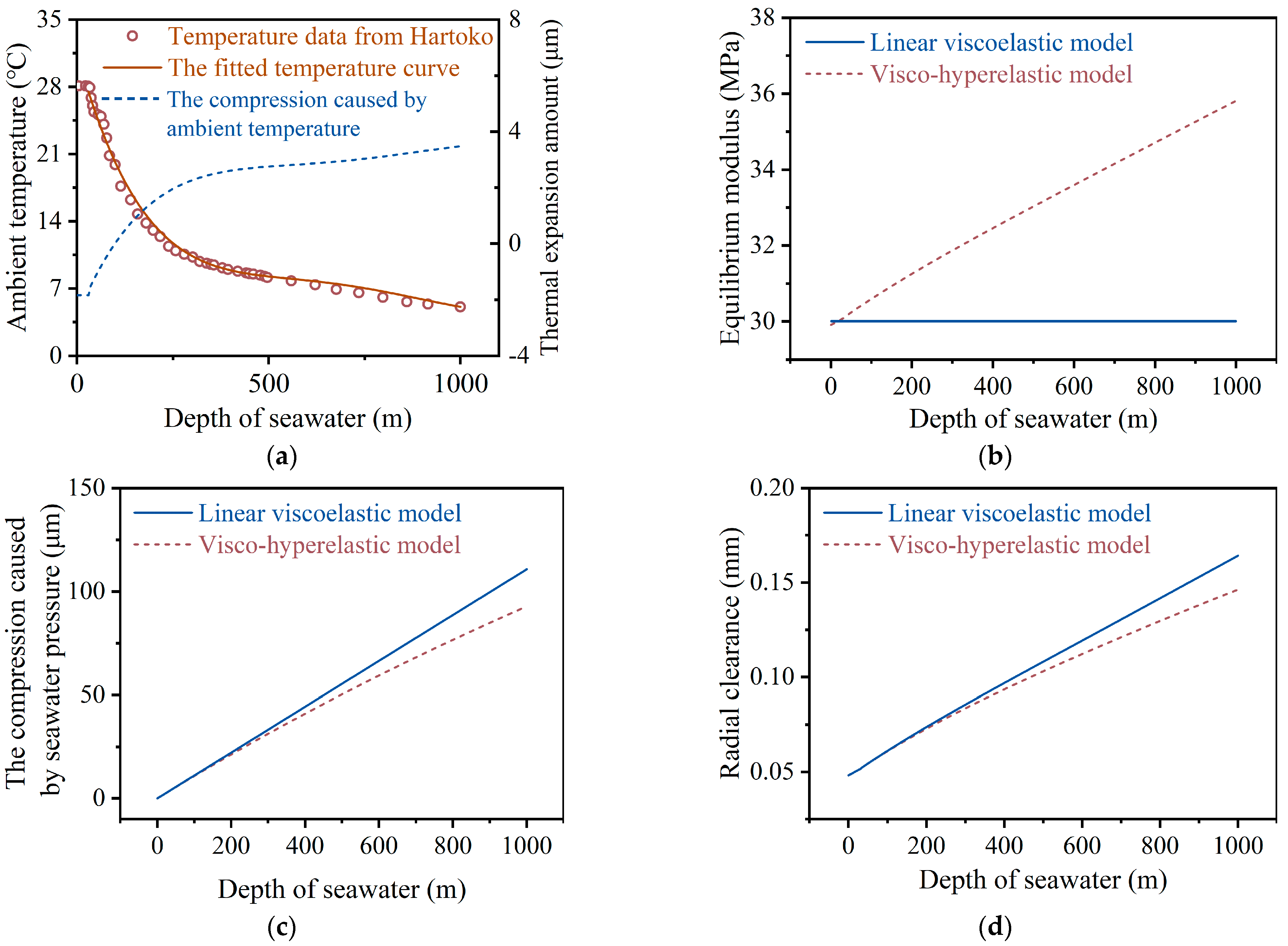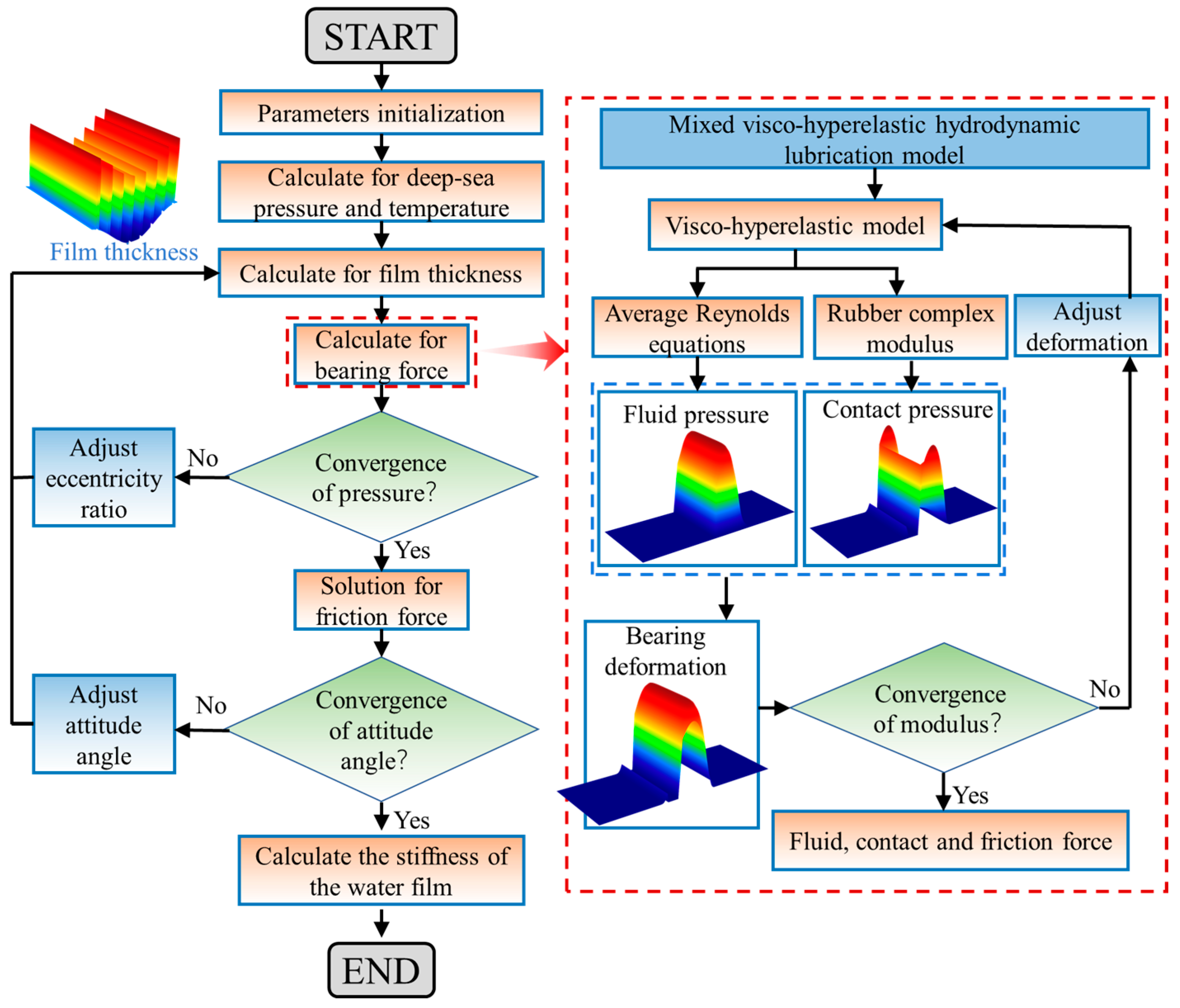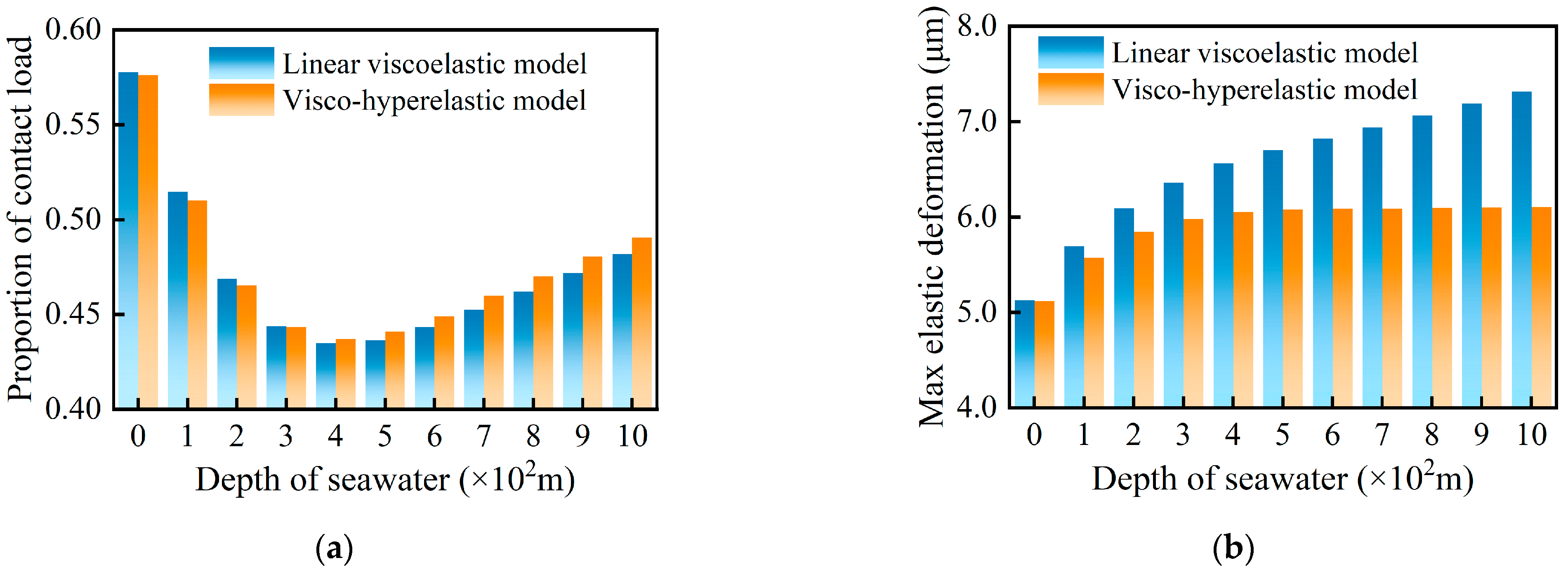 - Wang, L.; Xiao, K.; Xiang, G.; Cai, J.; Yang, T.; Wang, J. Study on mixed thermal-visco-hyerelastic hydrodynamic lubrication performance of water-lubricated rubber bearings in deep-sea environment. Tribol. Int. 2025, 209, 110713. [Google Scholar] [CrossRef]
