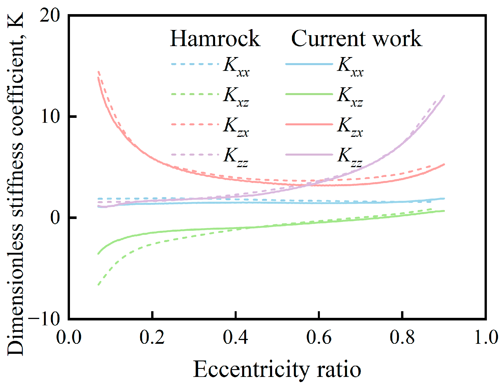 - Increasing rotational speed strengthens the hydrodynamic effect and enhances the water-film stiffness coefficient. However, the influence of the rotational speed on the water-film stiffness coefficient is more significant at lower speeds and weaker at higher speeds.