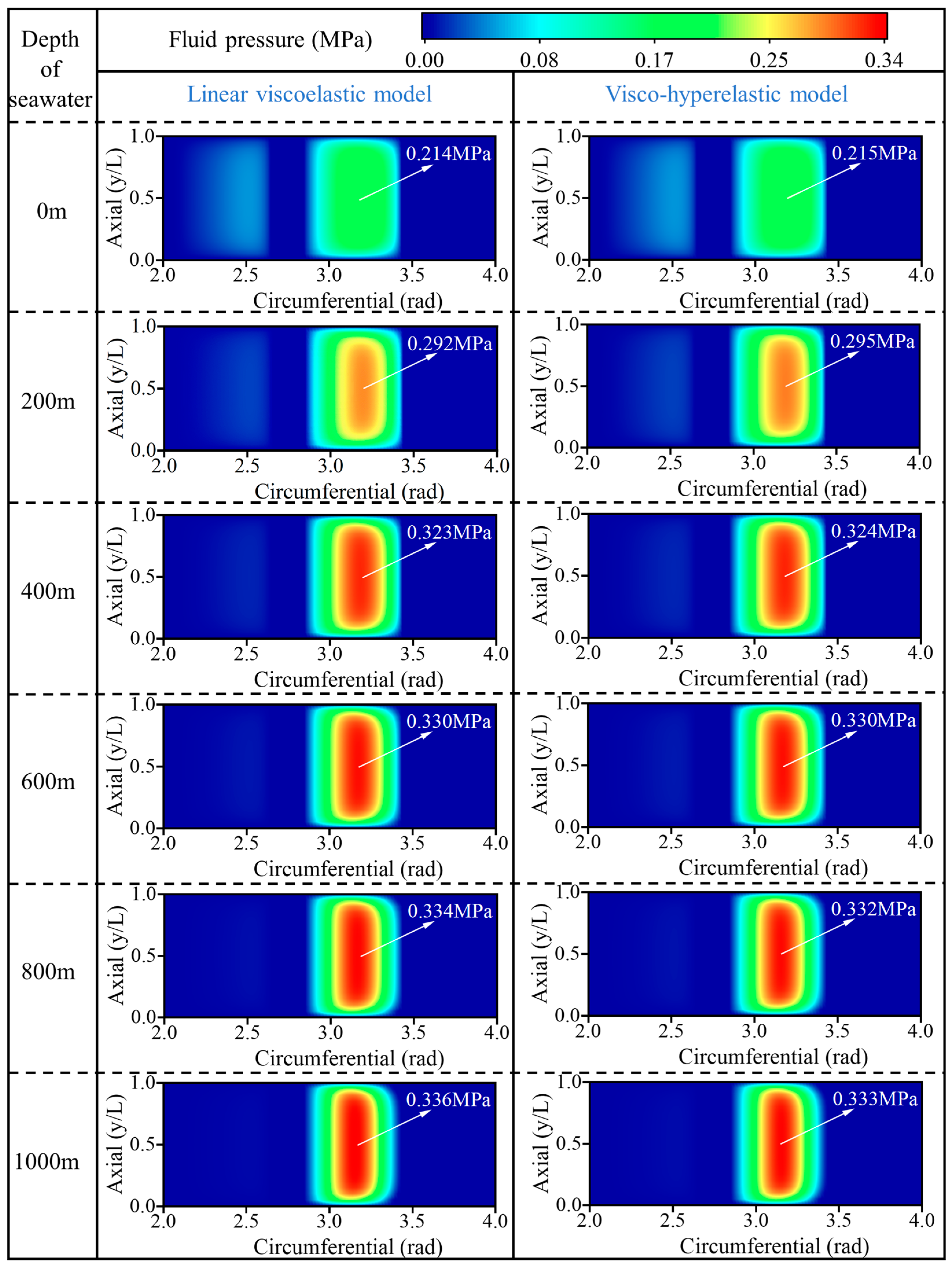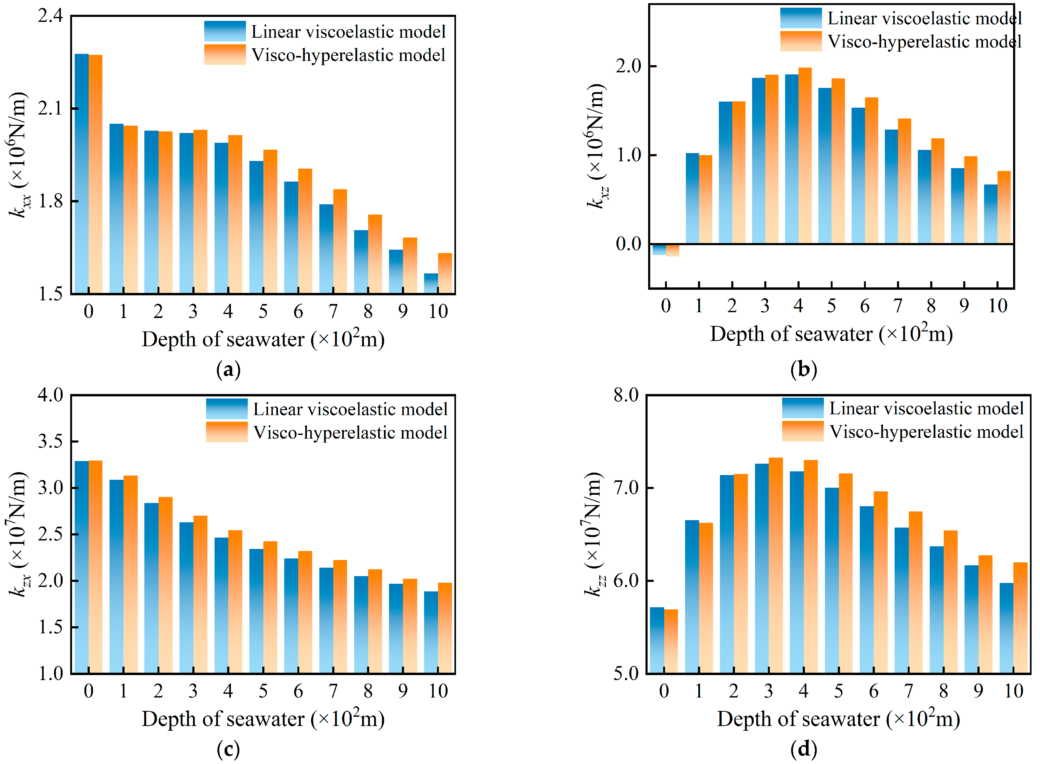 - The water-film stiffness coefficients obtained from the linear viscoelastic and visco-hyperelastic models exhibit significant discrepancies, with the divergence increasing progressively with seawater depth. At a depth of 1000 m, the relative error in kxz between the two models reaches as high as 18.41%, underscoring the importance of accounting for visco-hyperelastic behavior in accurately predicting the dynamic characteristics of the water film in deep-sea applications.